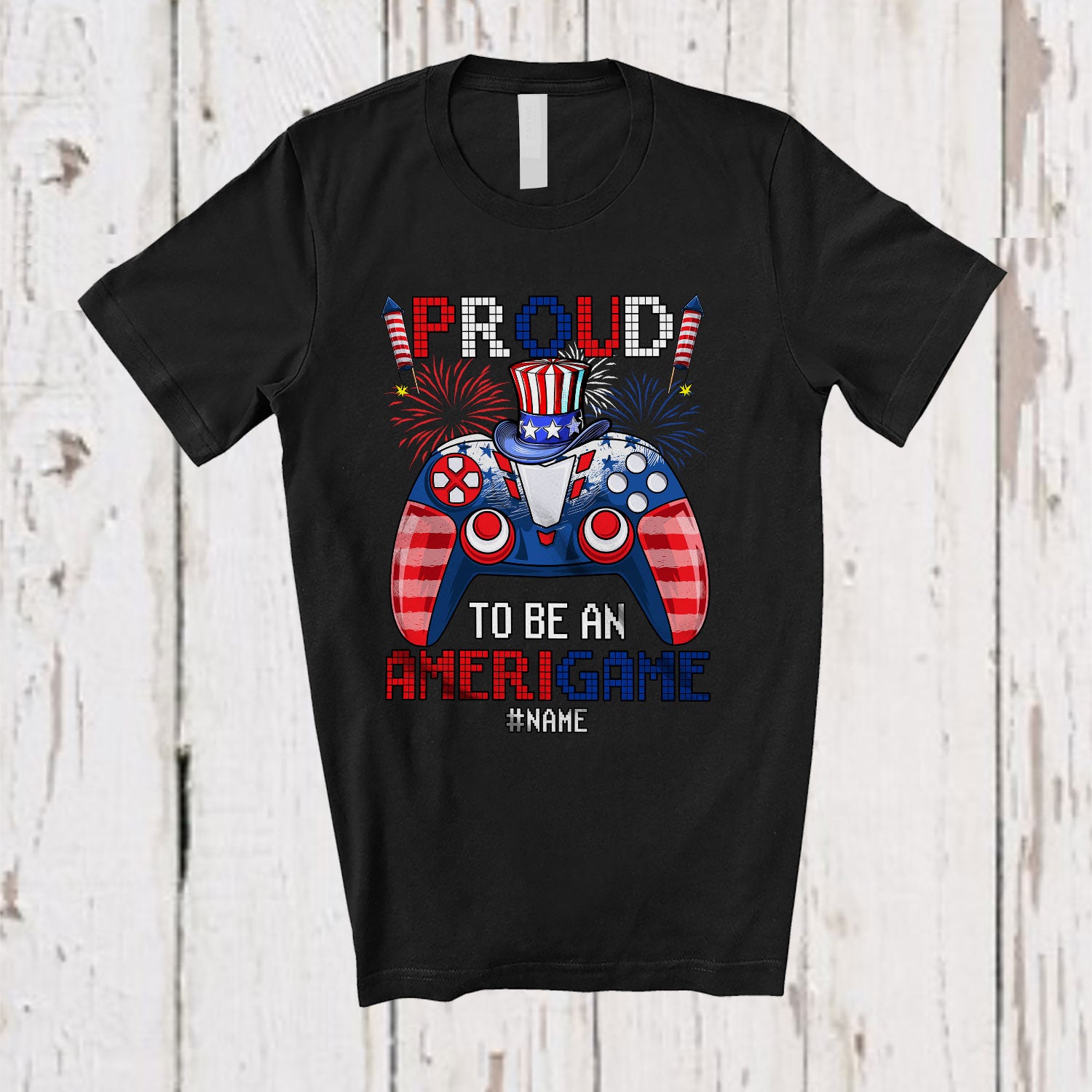 Personalized Proud To Be An Amerigame; Joyful 4th Of July Game Controller; Custom Name Gamer T-Shirt. This cotton t-shirt is a durable staple product with a classic fit. One of the most popular items, it has a relaxed style made for everyday and casual wear.
