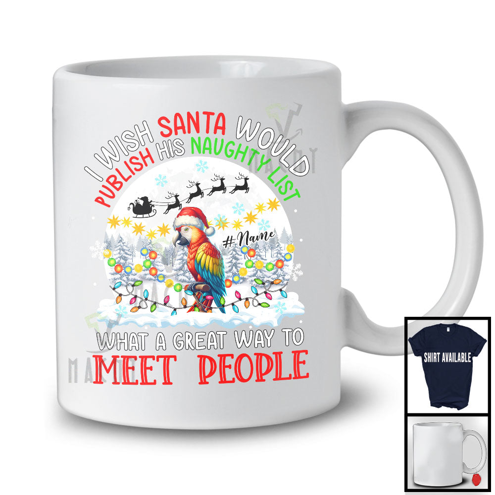 Personalized Publish His Naughty List; Lovely Christmas Custom Name Macaw Santa T-Shirt. This cotton t-shirt is a durable staple product with a classic fit. One of the most popular items, it has a relaxed style made for everyday and casual wear.