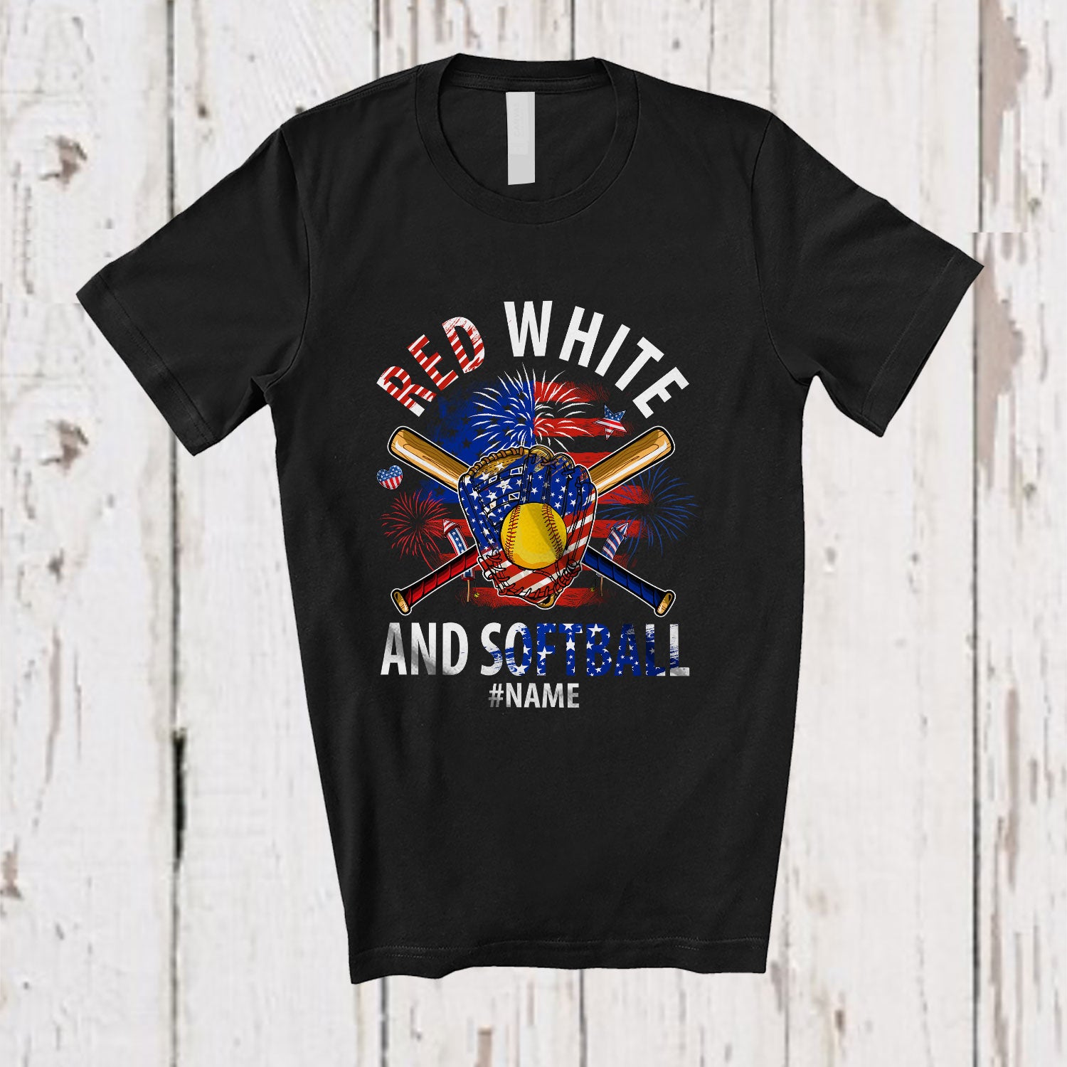 Personalized Red White And Softball; Amusing 4th Of July US Flag; Custom Name Player Patriotic T-Shirt. This cotton t-shirt is a durable staple product with a classic fit. One of the most popular items, it has a relaxed style made for everyday and casual wear.