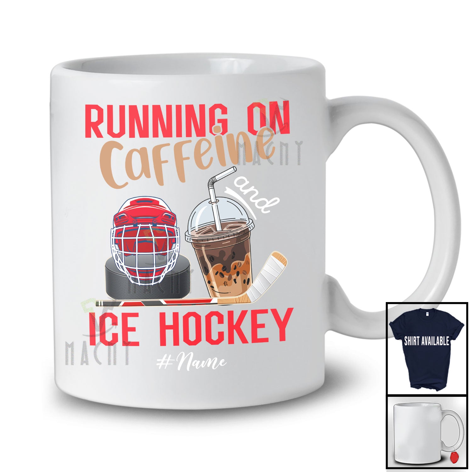 Personalized Running On Caffeine And Ice Hockey; Joyful Custom Name Coffee Ice Hockey Player T-Shirt. This cotton t-shirt is a durable staple product with a classic fit. One of the most popular items, it has a relaxed style made for everyday and casual wear.