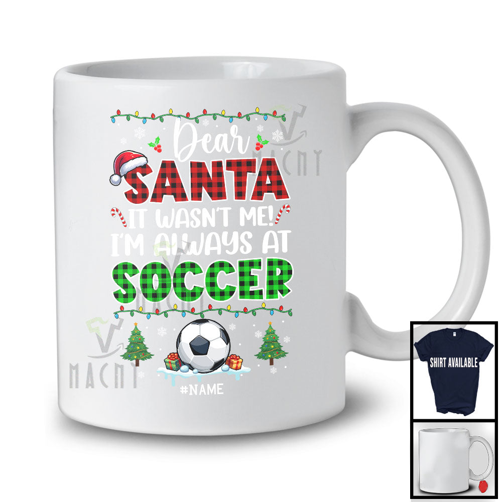 Personalized Santa It Wasn't Me Soccer; Joyful Christmas Plaid; Custom Name Sport Player T-Shirt