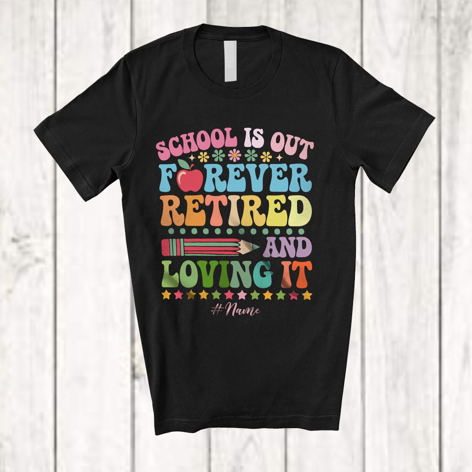 Personalized School Is Out Forever Retired And Loving It; Lovely Custom Name Students Teacher T-Shirt