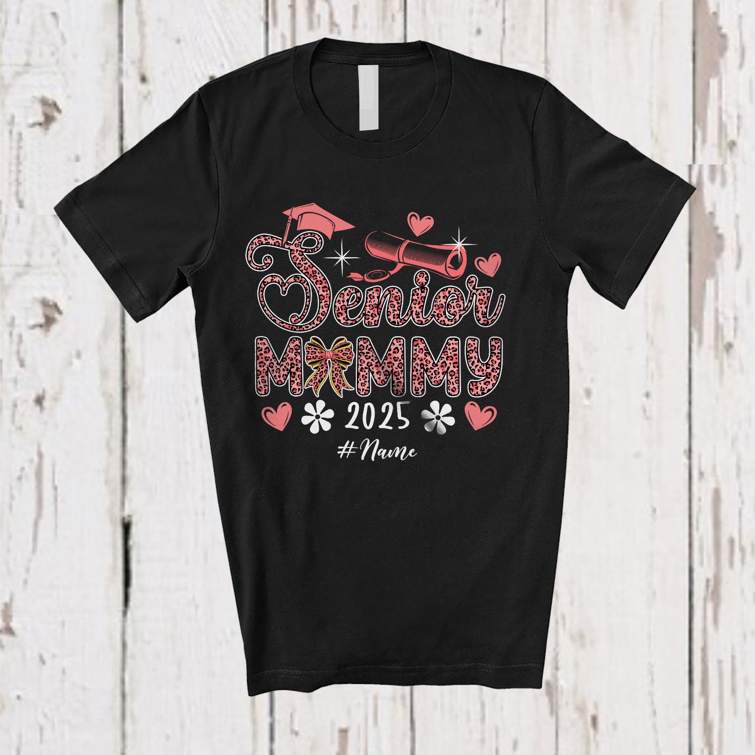 Personalized Senior Mommy 2025; Amusing Mother's Day Pink Leopard; Custom Name Graduate T-Shirt