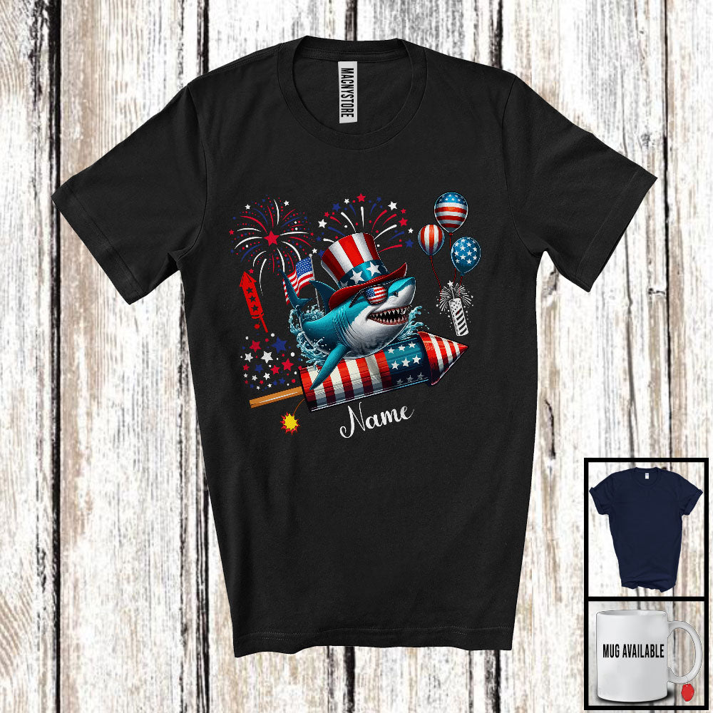 new MacnyStore - Personalized Shark Riding Firecracker, Lovely 4th Of July USA Flag Custom Name, Fish Sea Animal T-Shirt – Macnystore