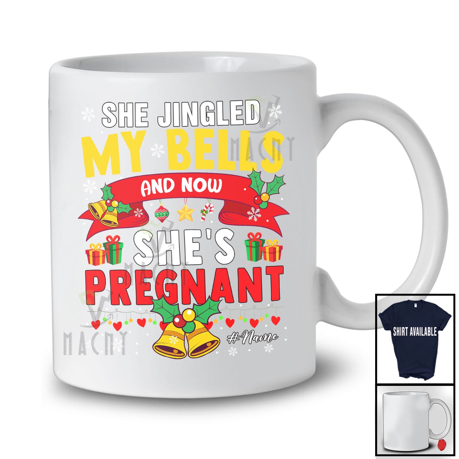 Personalized She Jingled His Bells Now I'm Pregnant; Amusing Christmas Custom Name Couple T-Shirt. This cotton t-shirt is a durable staple product with a classic fit. One of the most popular items, it has a relaxed style made for everyday and casual wear.