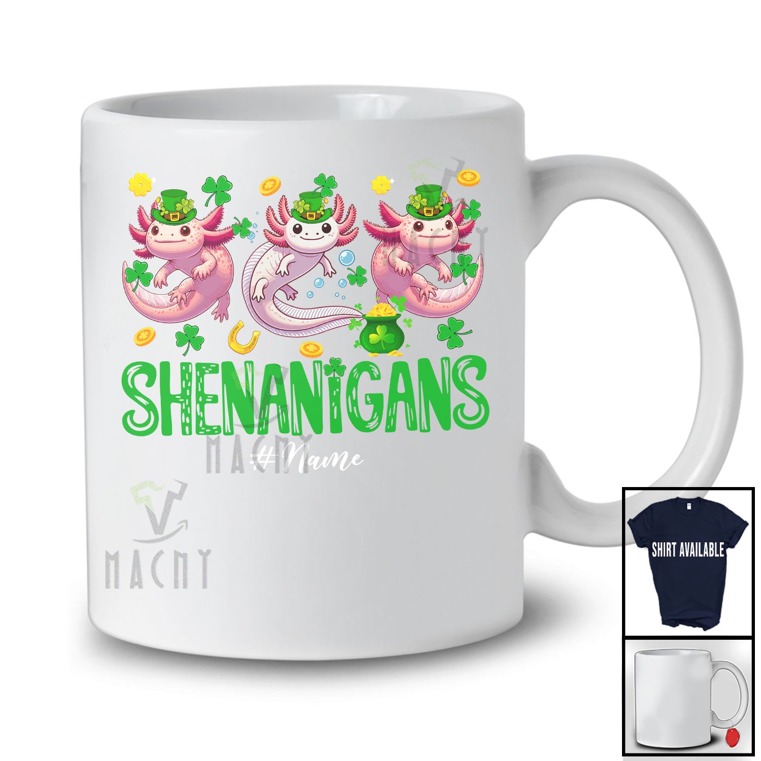 • Personalized Shenanigans; Amusing St. Patrick's Day Custom Name Three Irish Axolotls Leprechaun T-Shirt. This cotton t-shirt is a durable staple product with a classic fit. One of the most popular items, it has a relaxed style made for everyday and casual wear.
