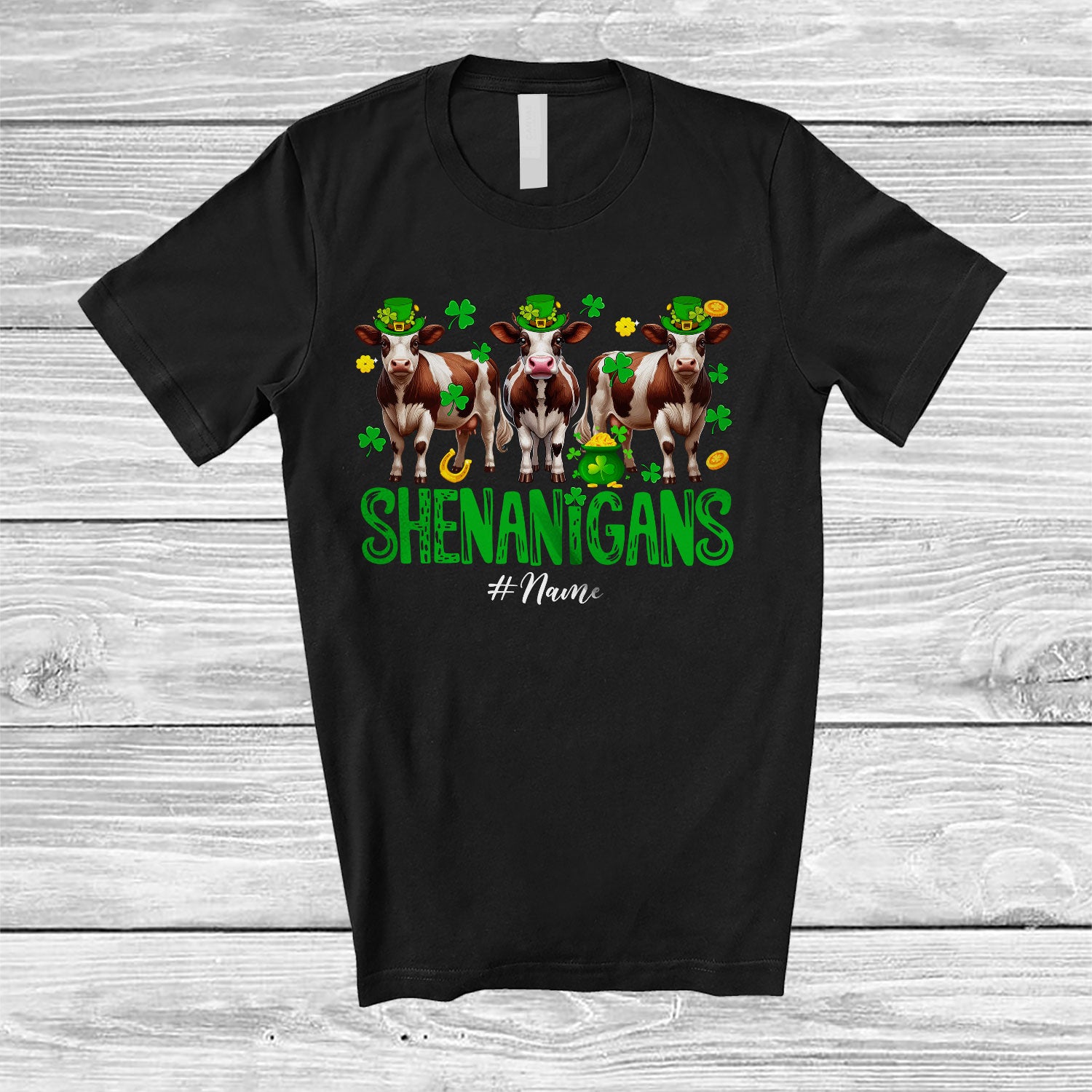 Personalized Shenanigans; Amusing St. Patrick's Day Custom Name Three Irish Cows Leprechaun T-Shirt