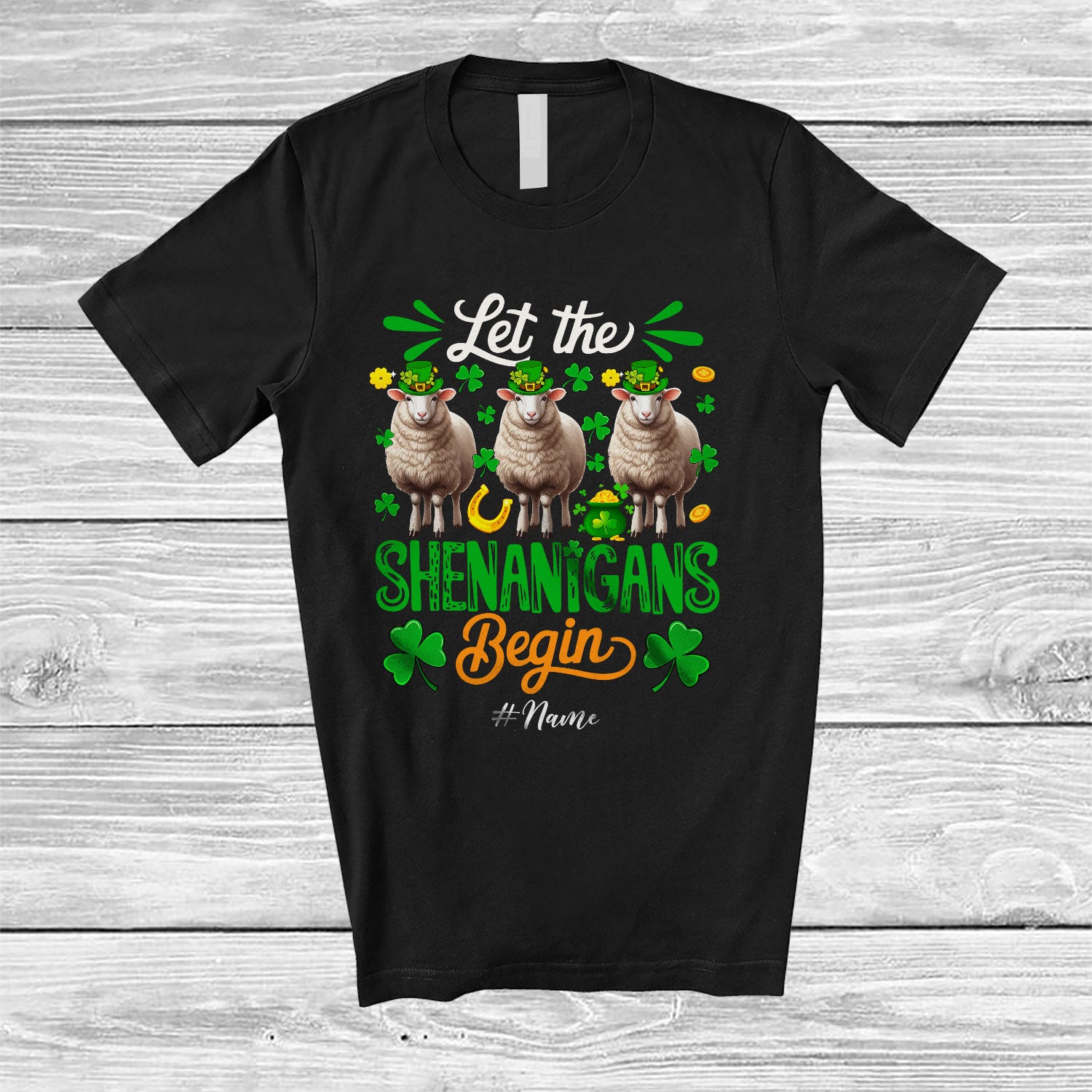 Personalized Shenanigans Begin; Amusing St. Patrick's Day Custom Name Three Sheeps Leprechaun T-Shirt. This cotton t-shirt is a durable staple product with a classic fit. One of the most popular items, it has a relaxed style made for everyday and casual wear.