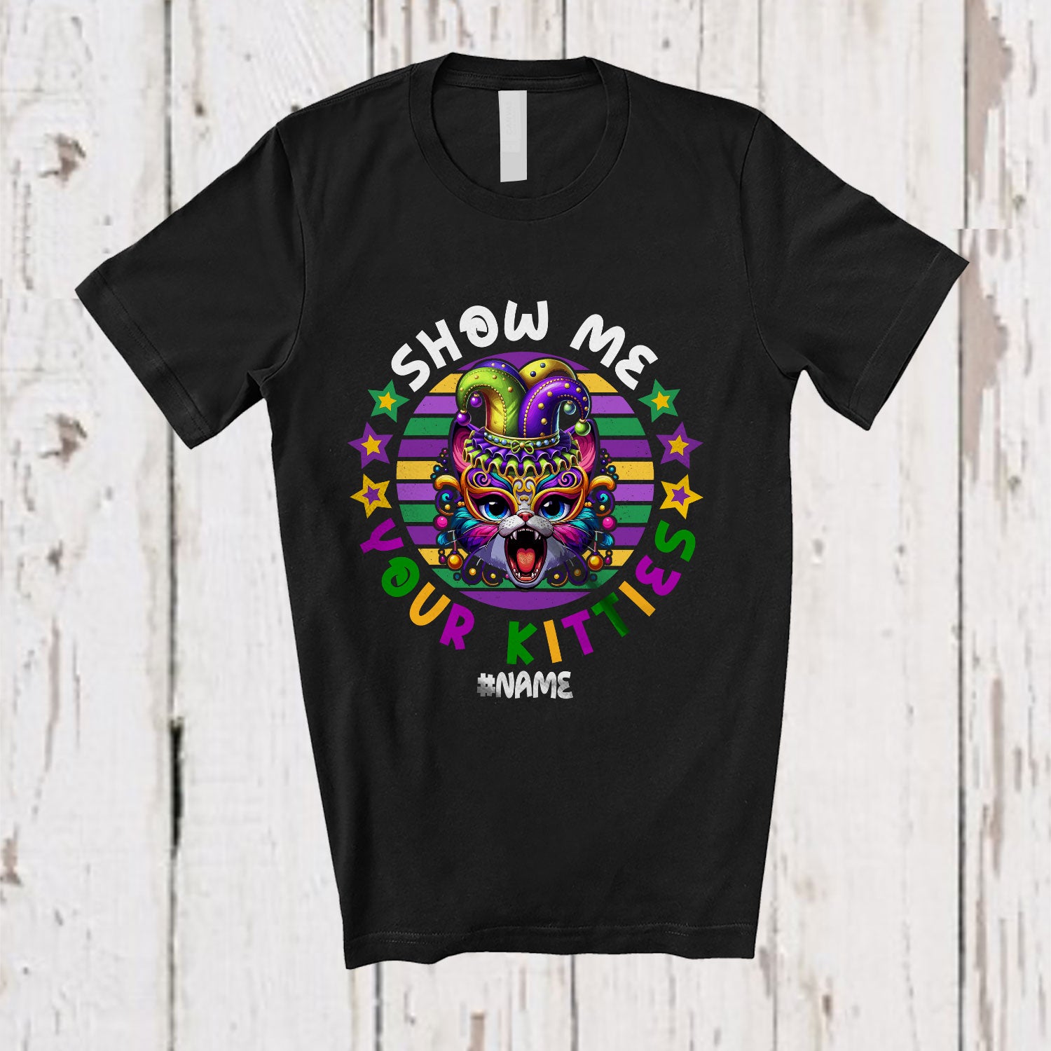 • Personalized Show Me Your Kitties; Amazing Mardi Gras Jester Hat Custom Name Kitten; Retro T-Shirt. This cotton t-shirt is a durable staple product with a classic fit. One of the most popular items, it has a relaxed style made for everyday and casual wear.