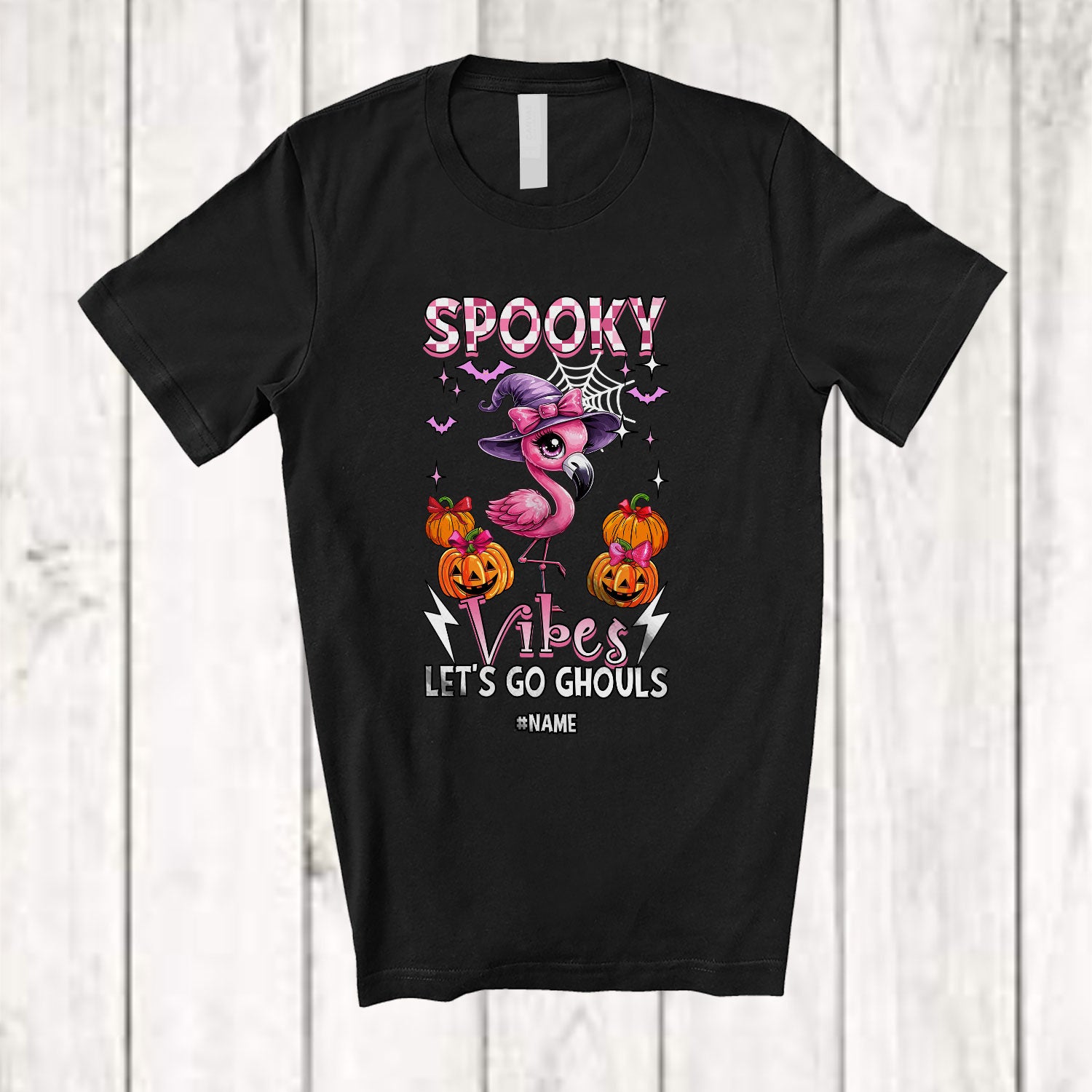 Personalized Spooky Vibes Let's Go Ghouls; Lovely Halloween Custom Name Flamingo Pumpkin T-Shirt