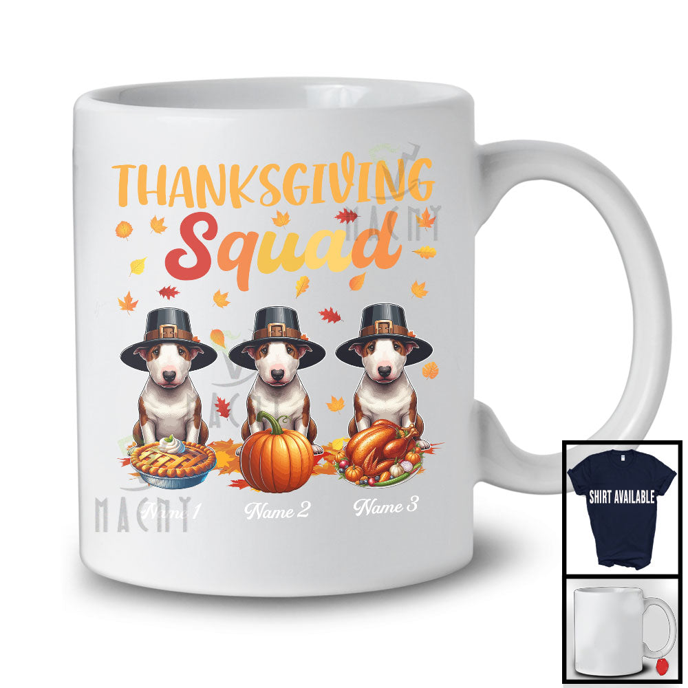 Personalized Thanksgiving Squad, Lovely Three Pilgrim Bull Terriers, Custom Name Fall Leaves T-Shirt