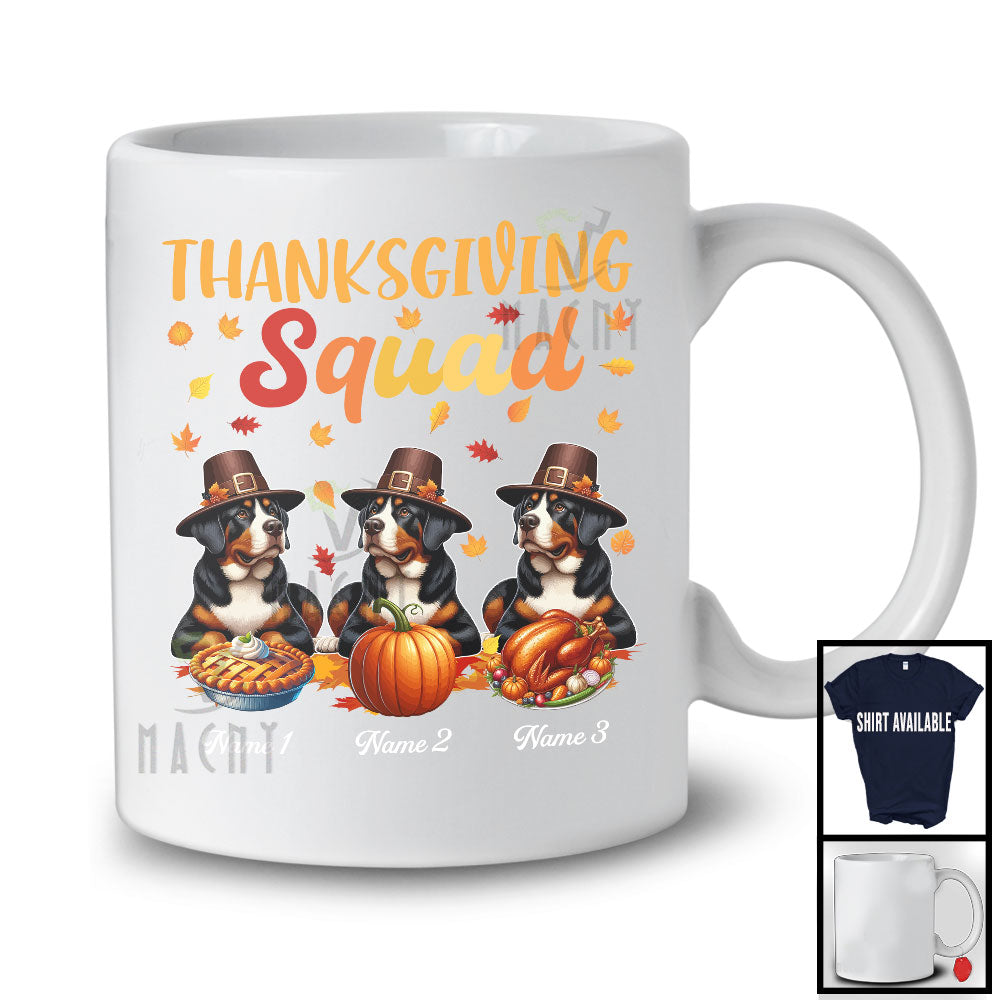Personalized Thanksgiving Squad, Lovely Three Pilgrim Greater Swiss Mountains, Custom Name Fall Leaves T-Shirt