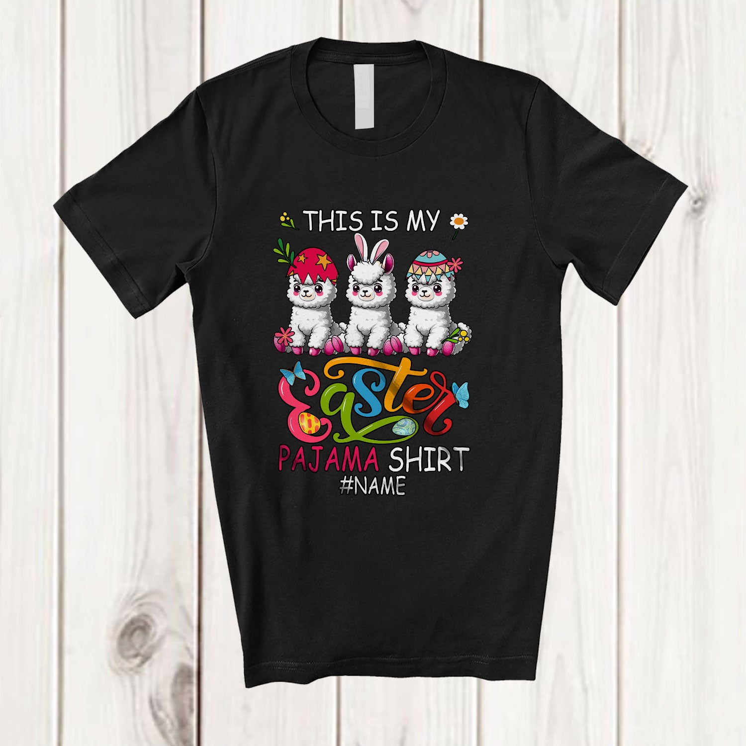• Personalized This Is My Easter Pajama Shirt; Lovely Custom Name Llama Eggs Bunnies; Family T-Shirt. This cotton t-shirt is a durable staple product with a classic fit. One of the most popular items, it has a relaxed style made for everyday and casual wear.