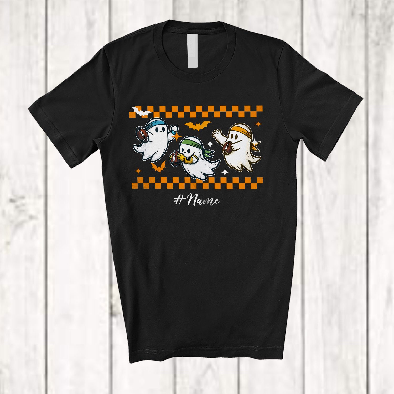 Personalized Three Boo Ghost Playing Football; Joyful Halloween Custom Name Football Sport Player T-Shirt