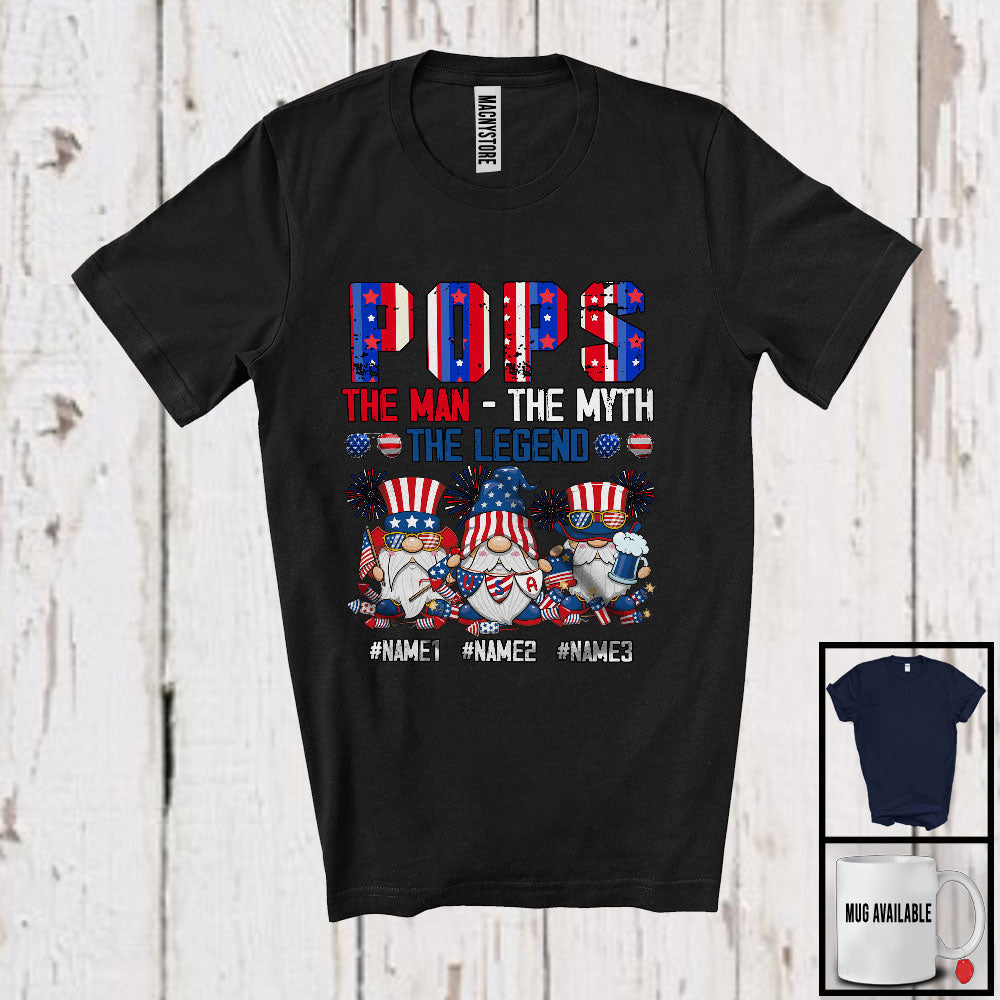 Personalized Three Gnomes Custom Name Pops Myth Legend, Proud 4th Of July Patriotic, Family T-Shirt. This cotton t-shirt is a durable staple product with a classic fit. One of the most popular items, it has a relaxed style made for everyday and casual wear.