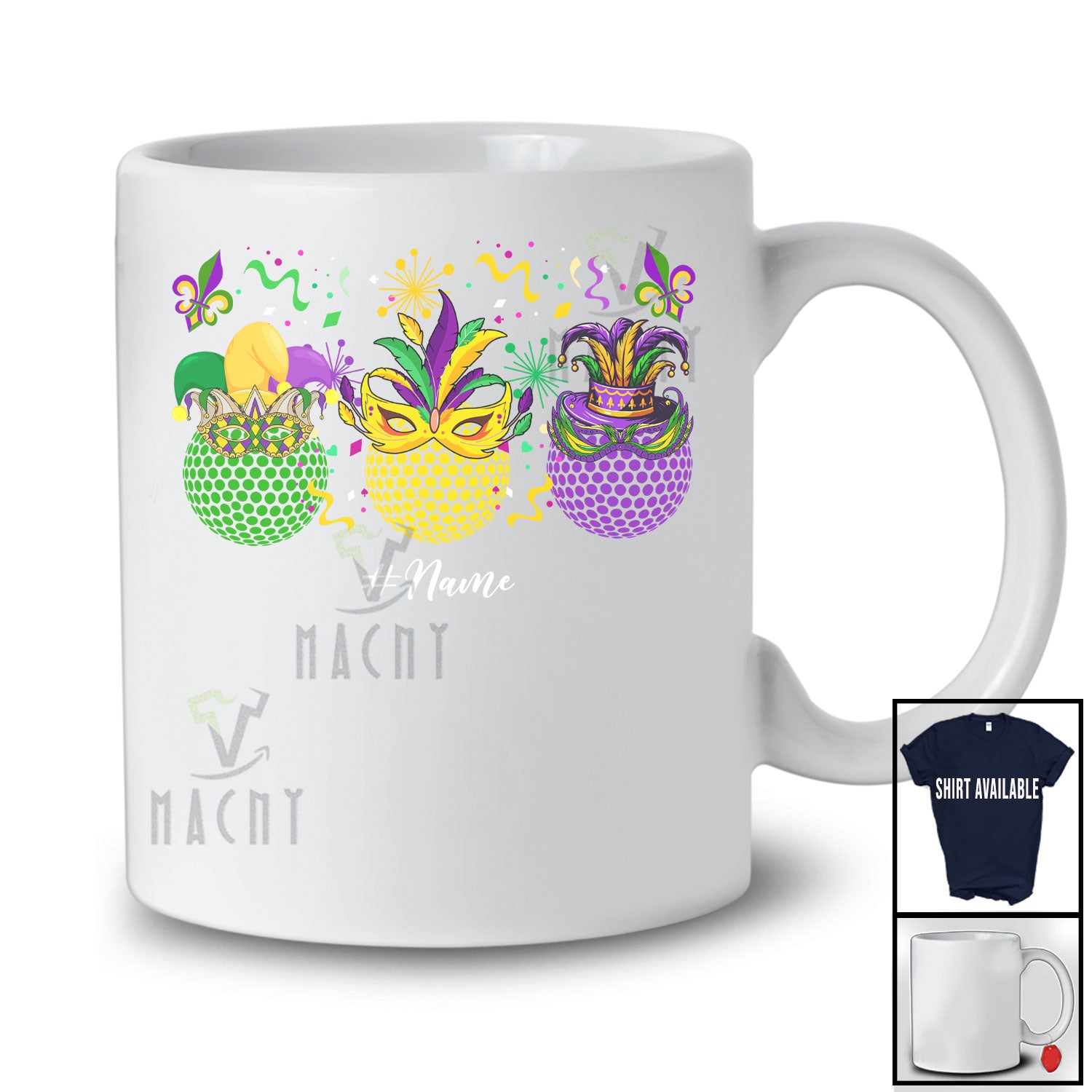 The Personalized Three Golf With Mask Jester Hat; Joyful Mardi Gras Custom Name Golf Player T-Shirt destined to impress, and priced at only $12.95, for a limited time.
