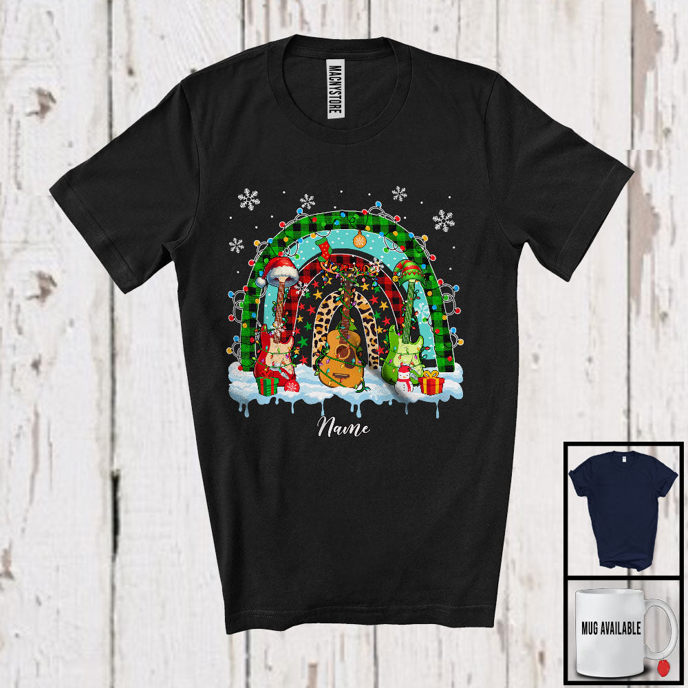 Personalized Three Santa Elf Guitar; Cheerful Christmas Leopard Plaid Rainbow; Custom Name Guitarist T-Shirt