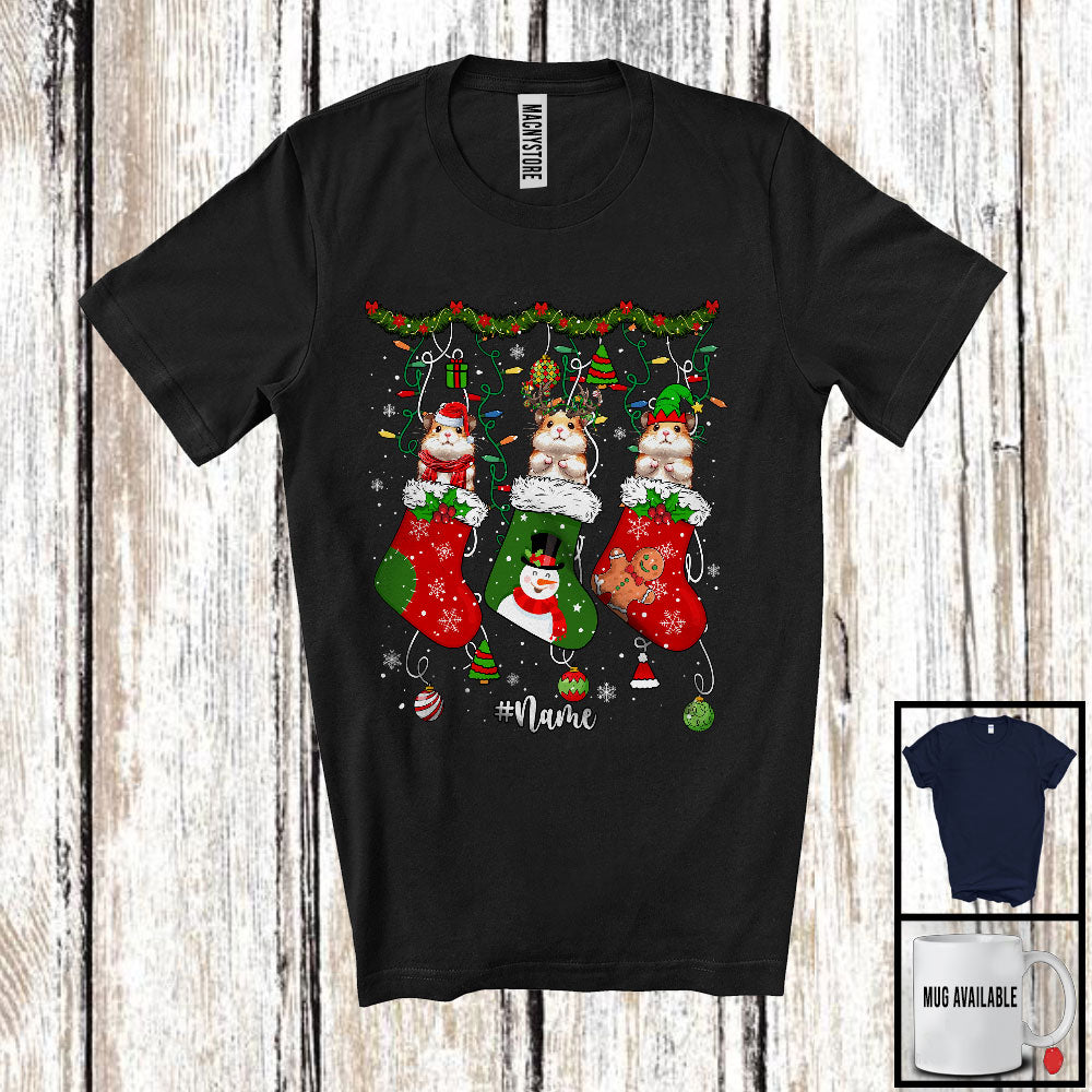 Personalized Three Santa Elf Hamster In Christmas Socks; Lovely Wild Animal Lover; Snowing T-Shirt