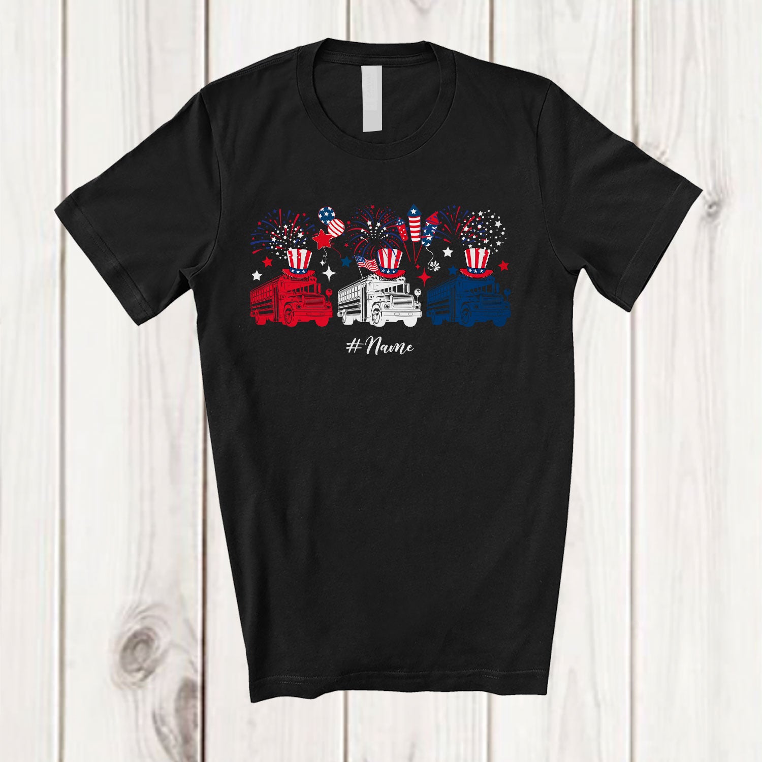 • Personalized Three School Bus Fireworks; Joyful 4th Of July Custom Name Driver; Family T-Shirt. This cotton t-shirt is a durable staple product with a classic fit. One of the most popular items, it has a relaxed style made for everyday and casual wear.
