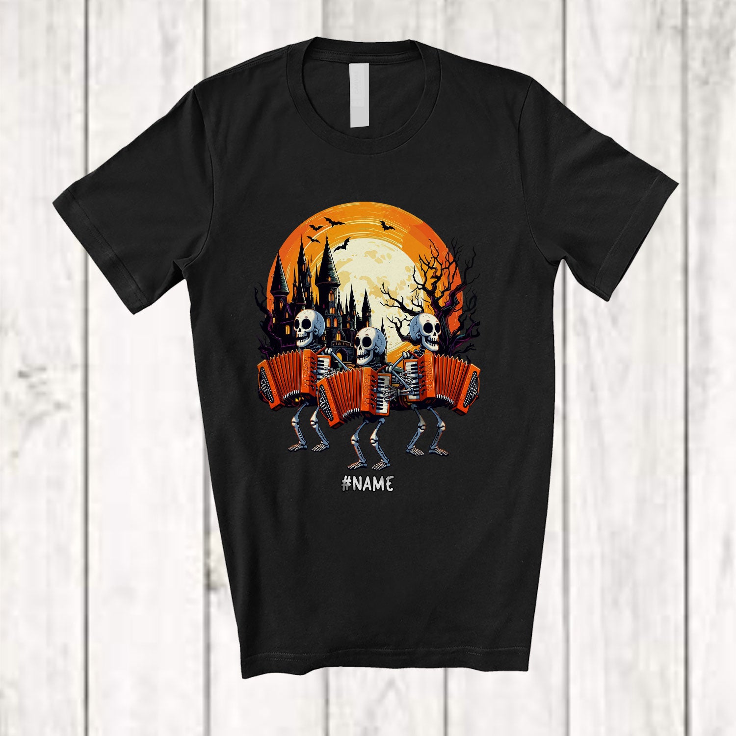 • Personalized Three Skeletons Playing Accordion; Joyful Halloween Custom Name Musician; Family T-Shirt. This cotton t-shirt is a durable staple product with a classic fit. One of the most popular items, it has a relaxed style made for everyday and casual wear.