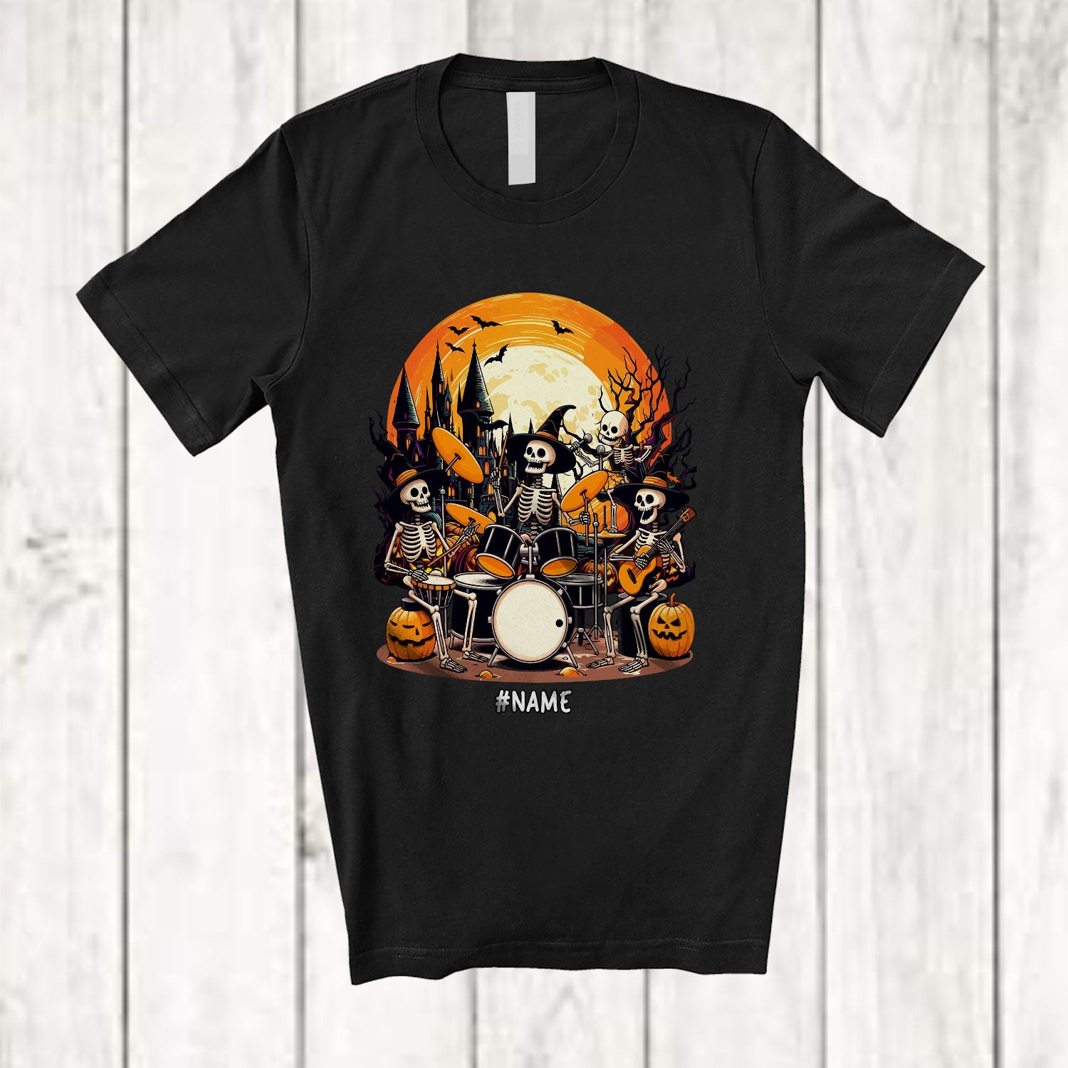 • Personalized Three Skeletons Playing Drum; Joyful Halloween Custom Name Musician; Family T-Shirt. This cotton t-shirt is a durable staple product with a classic fit. One of the most popular items, it has a relaxed style made for everyday and casual wear.