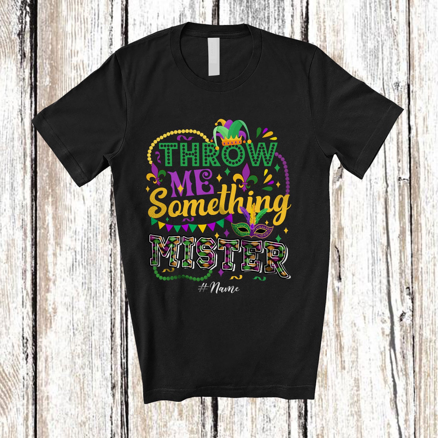 Personalized Throw Me Something Mister; Joyful Mardi Gras Custom Name Friends Family; Parades T-Shirt. This cotton t-shirt is a durable staple product with a classic fit. One of the most popular items, it has a relaxed style made for everyday and casual wear.