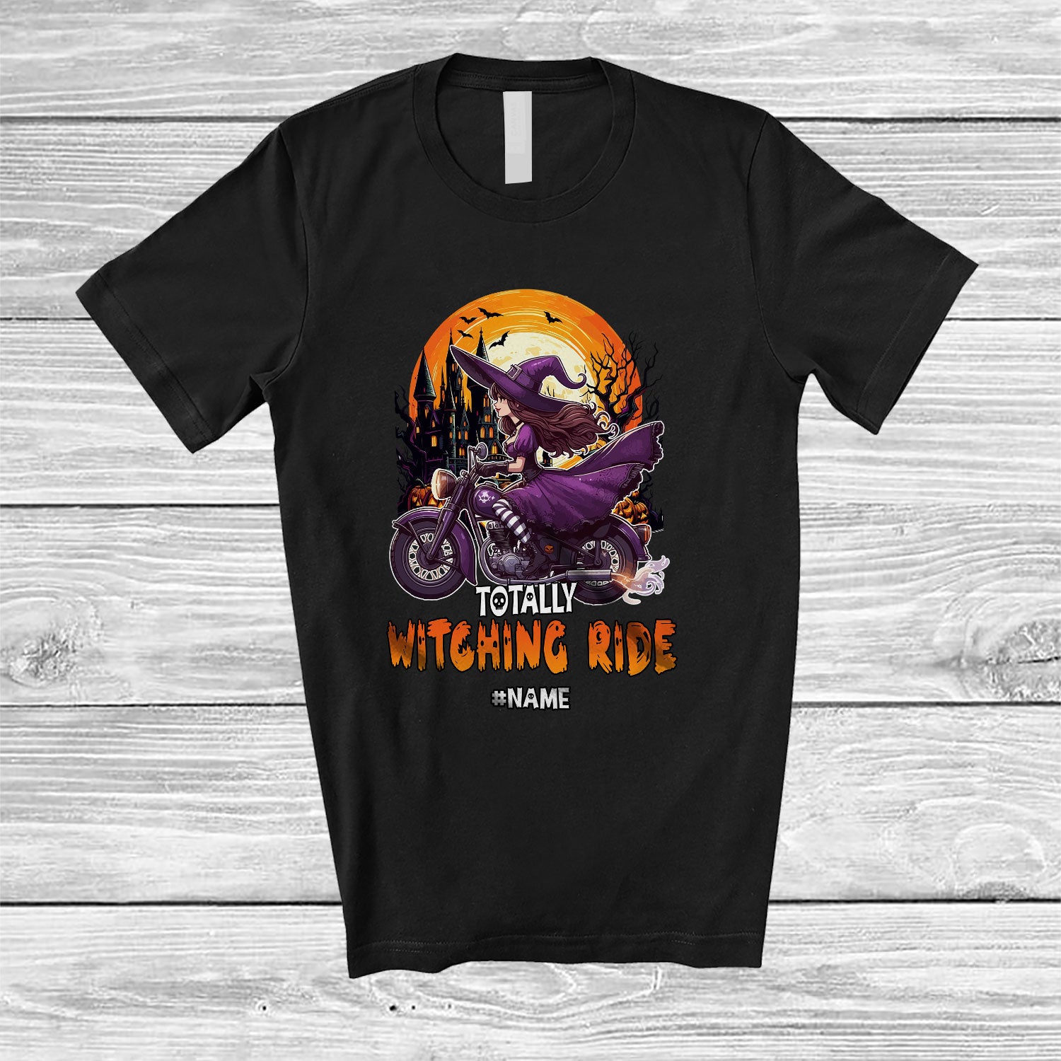 Personalized Totally Witching Ride; Joyful Halloween Moon Custom Name Witch Riding Motorbike T-Shirt