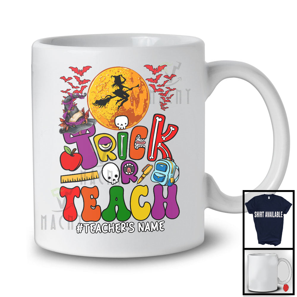 Personalized Trick Or Teach; Amazing Halloween Witch School Things; Custom Name Teacher Group T-Shirt. This cotton t-shirt is a durable staple product with a classic fit. One of the most popular items, it has a relaxed style made for everyday and casual wear.