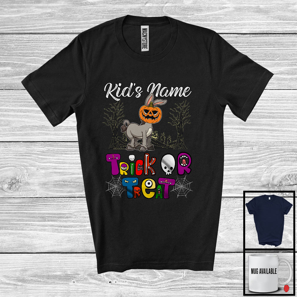 Personalized Trick Or Treat, Humorous Halloween Donkey Custom Name, Pumpkin Face Farmer T-Shirt. This cotton t-shirt is a durable staple product with a classic fit. One of the most popular items, it has a relaxed style made for everyday and casual wear.