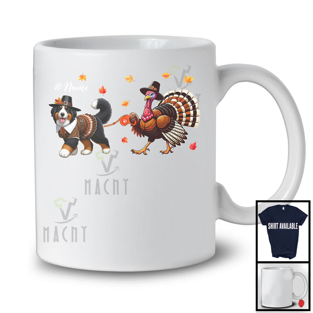 • Personalized Turkey Walking With Bernedoodle; Happy Thanksgiving Custom Name Family T-Shirt. This cotton t-shirt is a durable staple product with a classic fit. One of the most popular items, it has a relaxed style made for everyday and casual wear.