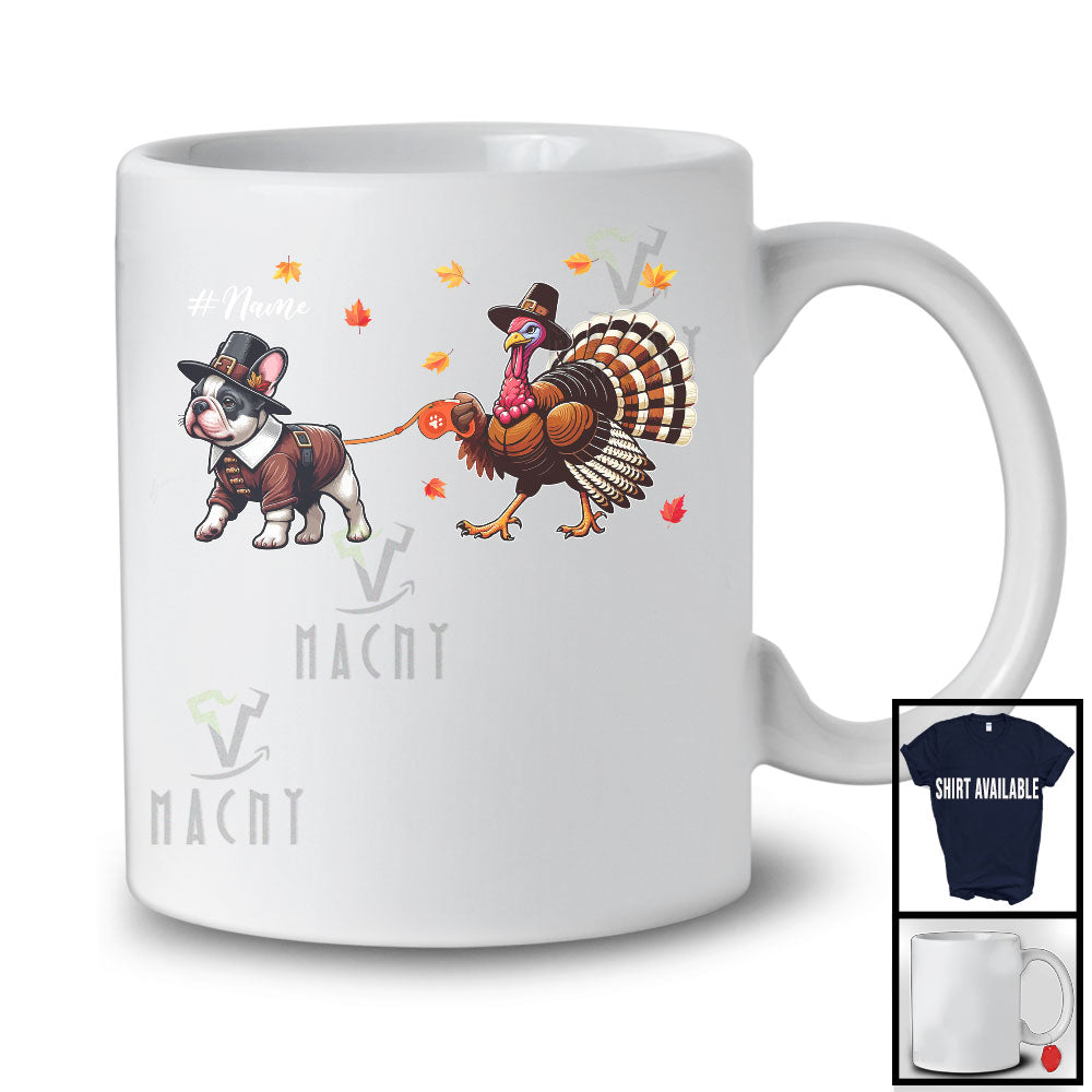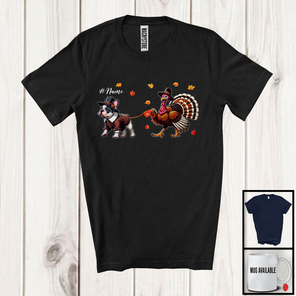Personalized Turkey Walking With French Bulldog; Happy Thanksgiving Custom Name Family T-Shirt