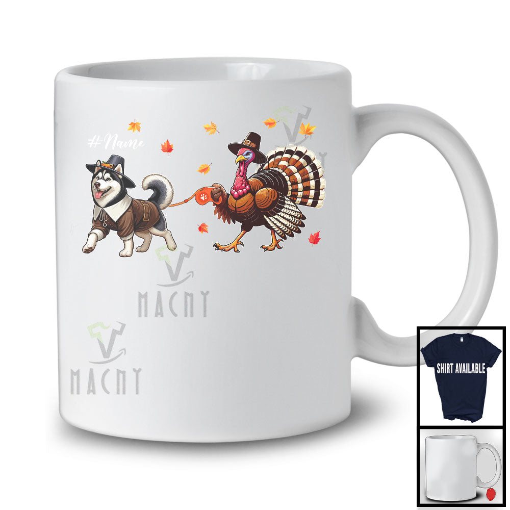 Personalized Turkey Walking With Husky; Happy Thanksgiving Custom Name Family T-Shirt