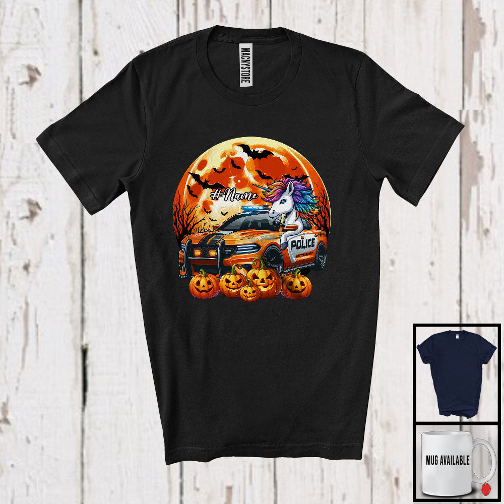 Personalized Unicorn Driving Police Car; Creepy Halloween Moon Custom Name Driver T-Shirt. This cotton t-shirt is a durable staple product with a classic fit. One of the most popular items, it has a relaxed style made for everyday and casual wear.