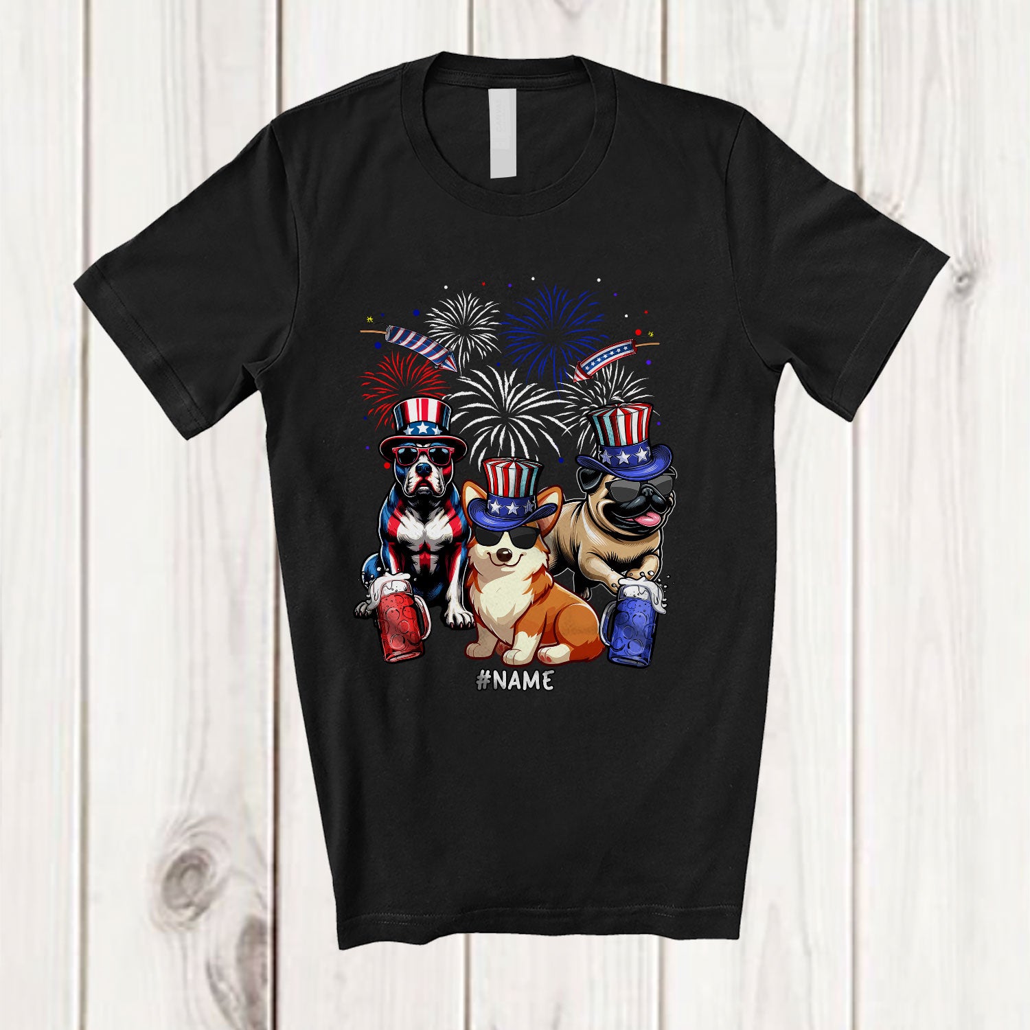 Personalized US Flag Pit Bull Corgi Pug Sunglasses; Lovely 4th Of July Custom Name Patriotic T-Shirt. This cotton t-shirt is a durable staple product with a classic fit. One of the most popular items, it has a relaxed style made for everyday and casual wear.