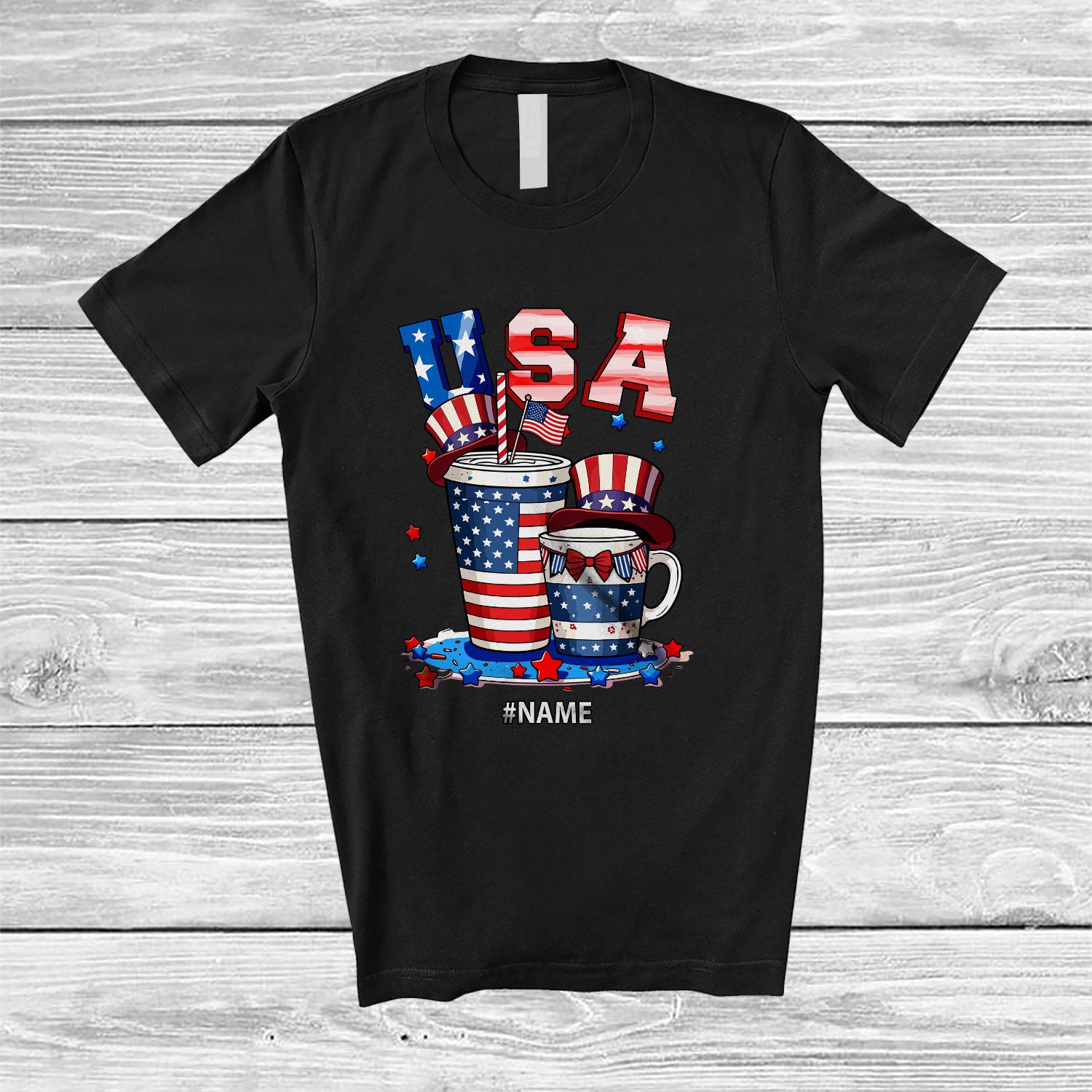 Personalized USA; Fantastic 4th Of July Coffee Glasses; Custom Name Coffee Lover Patriotic T-Shirt. This cotton t-shirt is a durable staple product with a classic fit. One of the most popular items, it has a relaxed style made for everyday and casual wear.