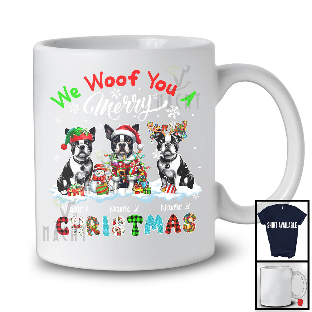 Personalized We Woof You A Merry Christmas; Lovely Plaid Boston Terriers Custom Name T-Shirt