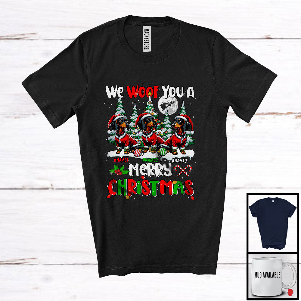 Personalized We Woof You A Merry Christmas; Lovely Three Santa Dachshunds; X-mas Tree T-Shirt