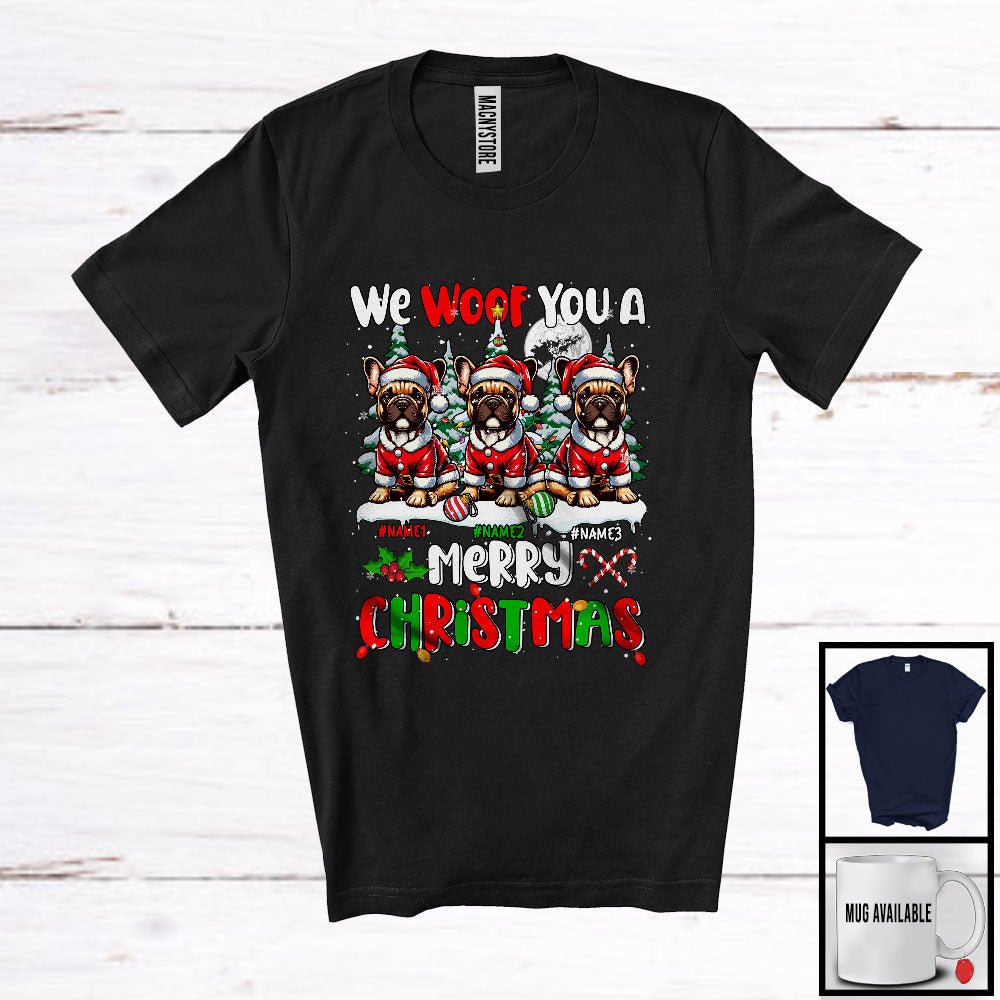 Personalized We Woof You A Merry Christmas; Lovely Three Santa French Bulldogs; X-mas Tree T-Shirt