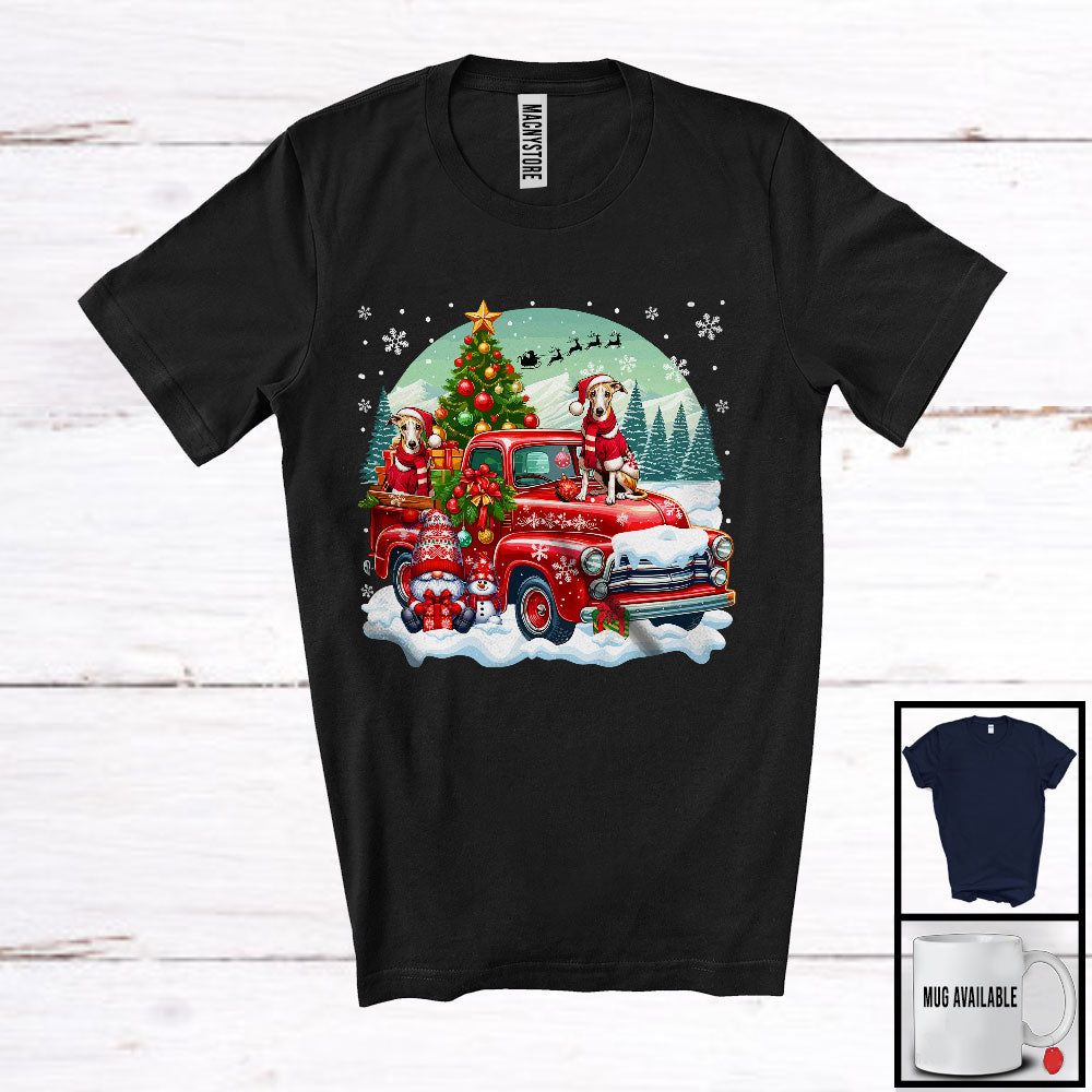 Santa Whippet On Pickup Truck; Joyful Christmas Moon Gnome Gnomies; Winter Snowing T-Shirt