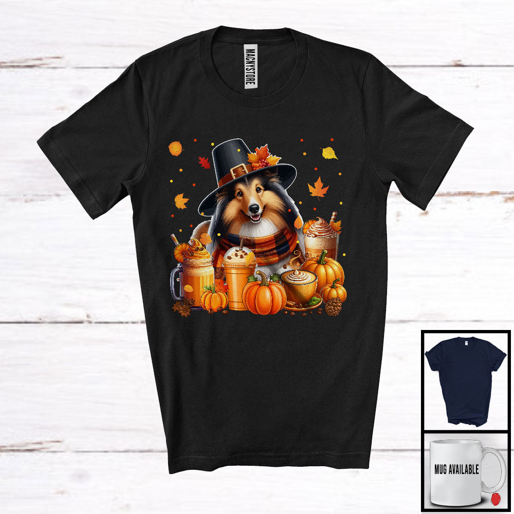 new MacnyStore - Sheltie With Coffee Smoothie, Wonderful Thanksgiving Pumpkins Drinks Fall Leaves T-Shirt – Macnystore