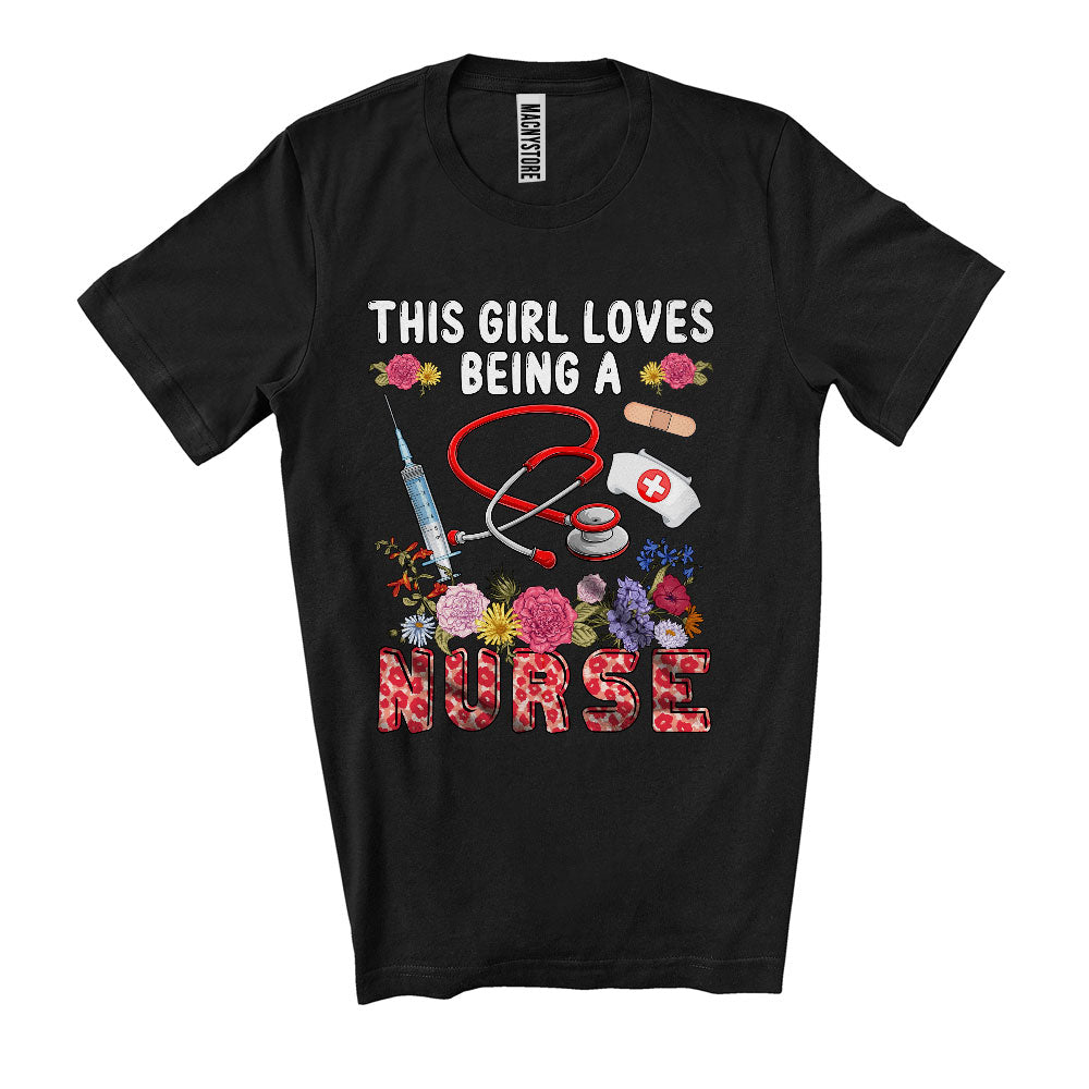 This Girl Loves Being A Nurse, Cool Leopard Plaid Nurse Nursing Tools, Flowers Family Group T-Shirt. This cotton t-shirt is a durable staple product with a classic fit. One of the most popular items, it has a relaxed style made for everyday and casual wear.