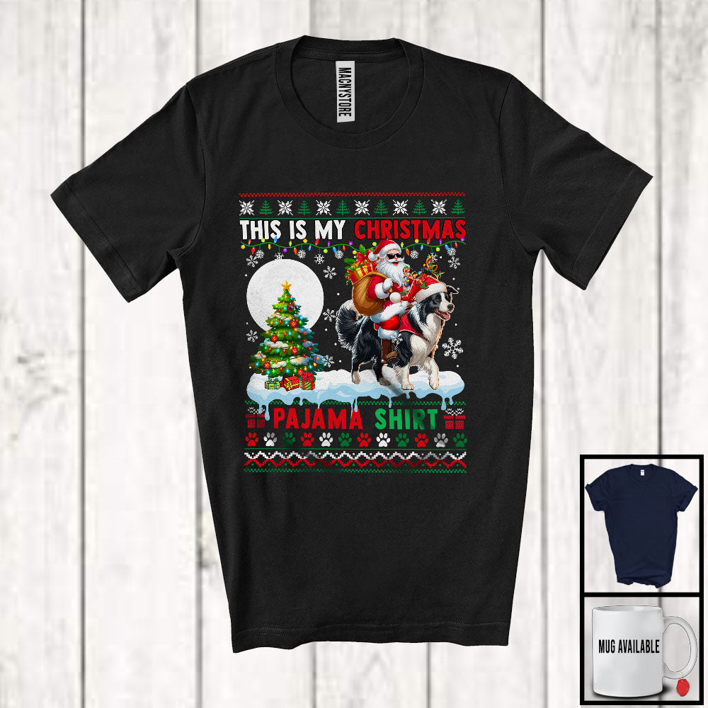 This Is My Christmas Pajama Shirt; Joyful Santa Riding Reindeer Border Collie Puppy; X-mas Sweater T-Shirt. This cotton t-shirt is a durable staple product with a classic fit. One of the most popular items, it has a relaxed style made for everyday and casual wear.