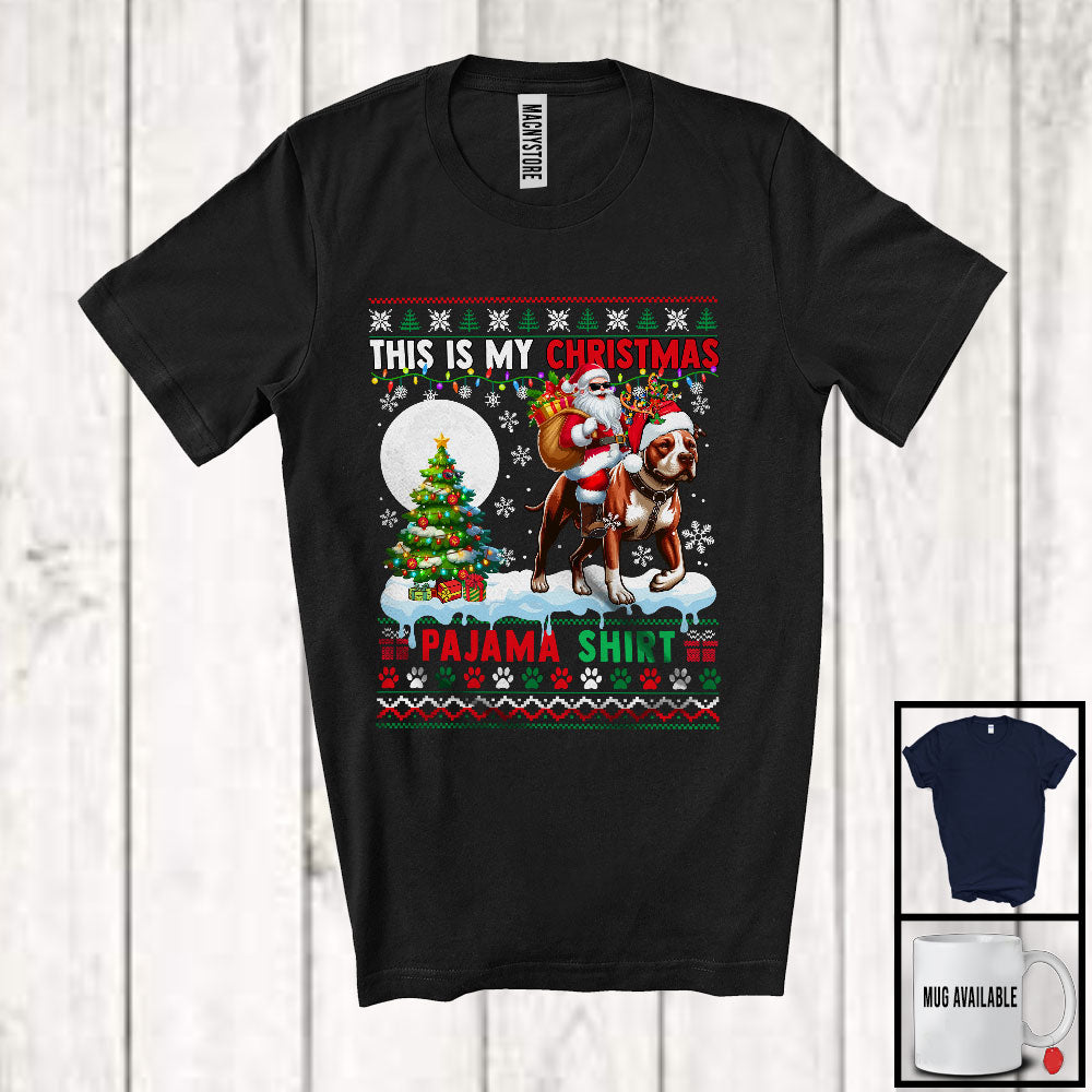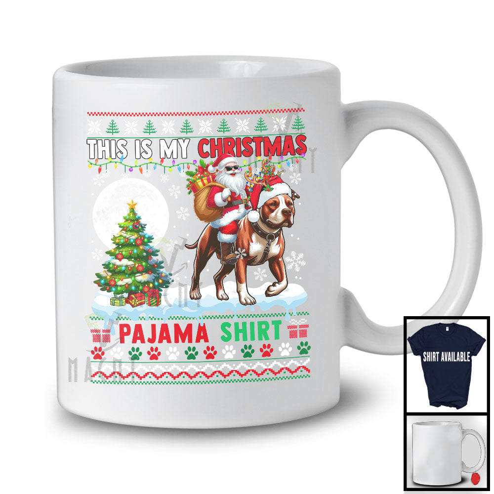 • This Is My Christmas Pajama Shirt; Joyful Santa Riding Reindeer Pit Bull Puppy; X-mas Sweater T-Shirt. This cotton t-shirt is a durable staple product with a classic fit. One of the most popular items, it has a relaxed style made for everyday and casual wear.