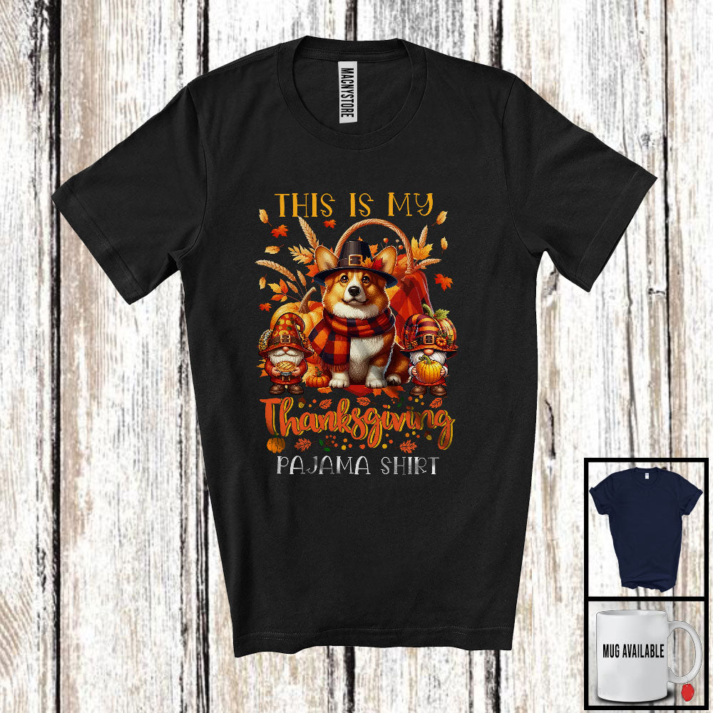 This Is My Thanksgiving Pajama Shirt, Adorable Gnomes Corgi Owner, Fall Leaves Pumpkins T-Shirt