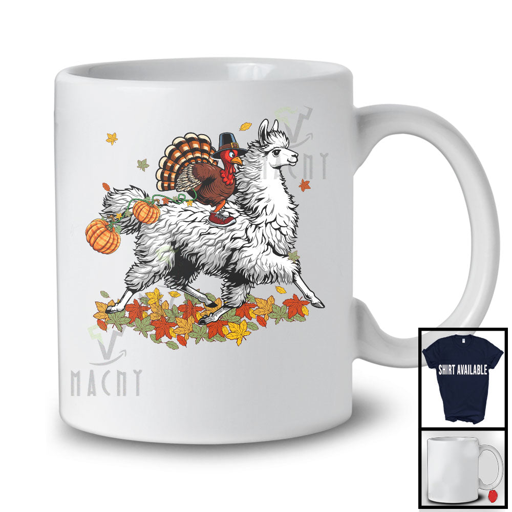 Turkey Riding Llama; Humorous Thanksgiving Autumn Leaves Animal; Pumpkin Family Group T-Shirt. This cotton t-shirt is a durable staple product with a classic fit. One of the most popular items, it has a relaxed style made for everyday and casual wear.