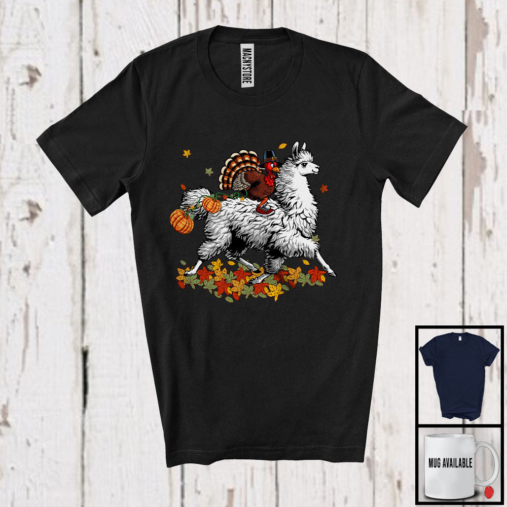 Turkey Riding Llama; Humorous Thanksgiving Autumn Leaves Animal; Pumpkin Family Group T-Shirt