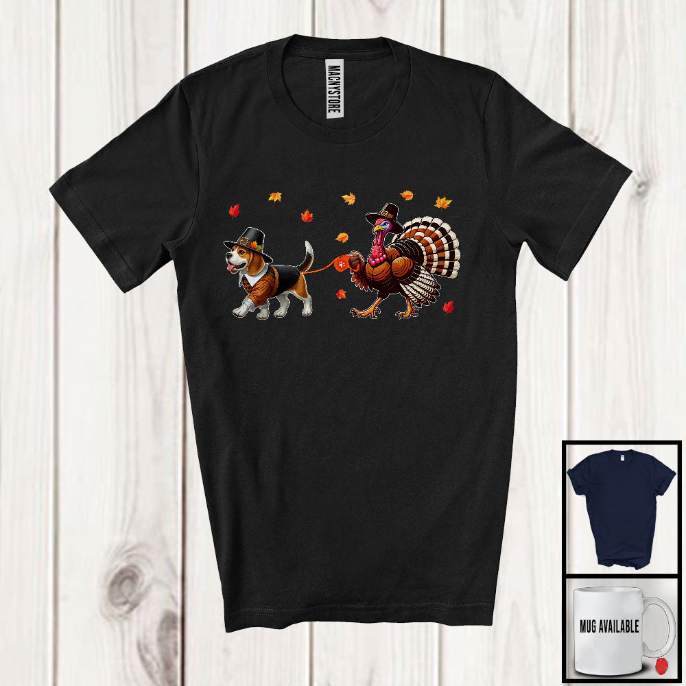 Turkey Walking With Beagle; Humorous Thanksgiving Turkey Fall Leaves; Family Group T-Shirt. This cotton t-shirt is a durable staple product with a classic fit. One of the most popular items, it has a relaxed style made for everyday and casual wear.