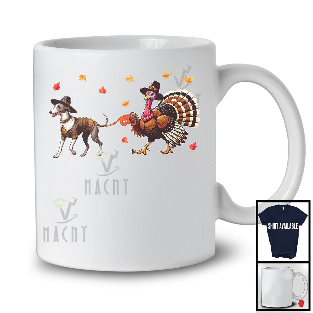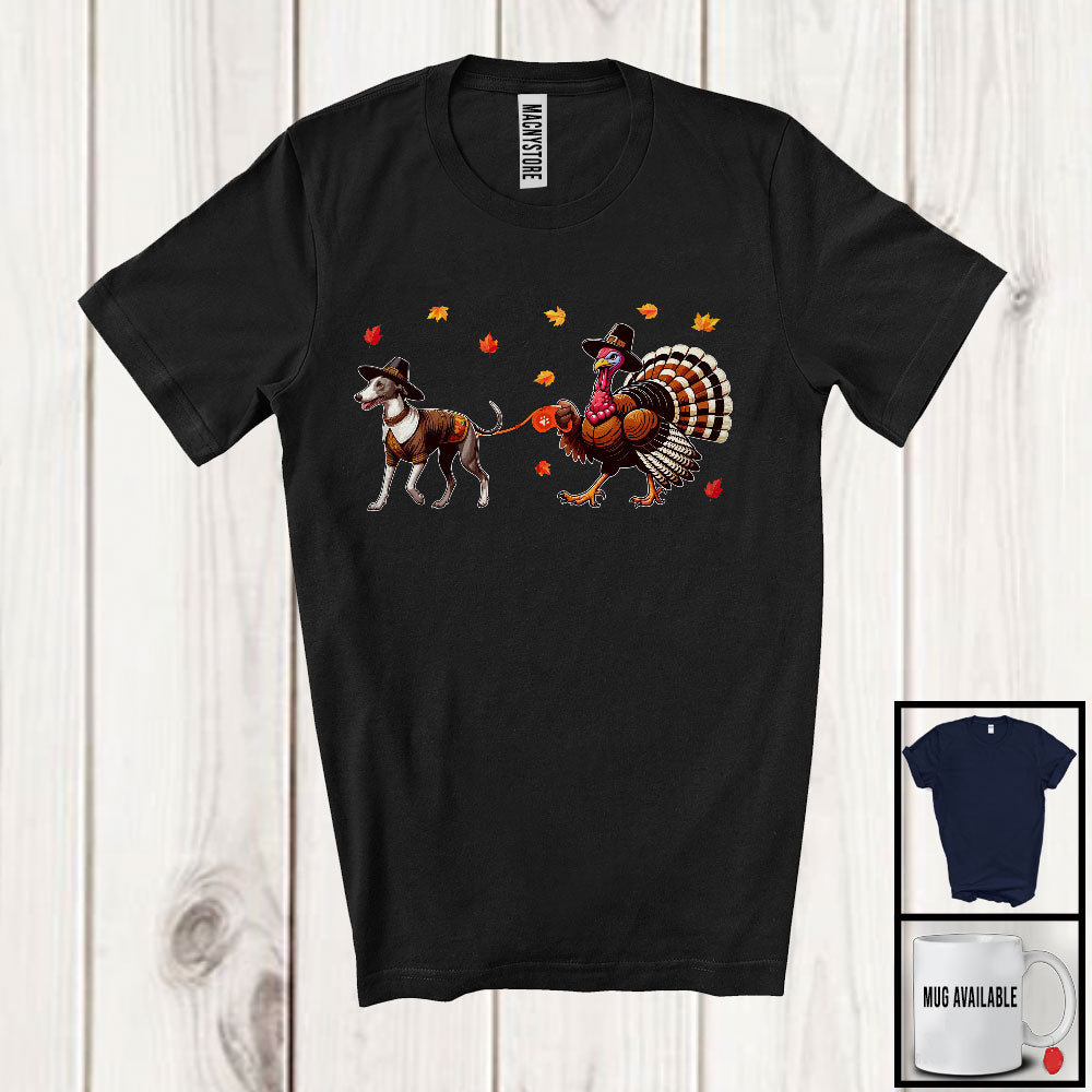Turkey Walking With Whippet; Humorous Thanksgiving Turkey Fall Leaves; Family Group T-Shirt