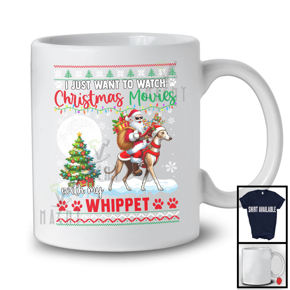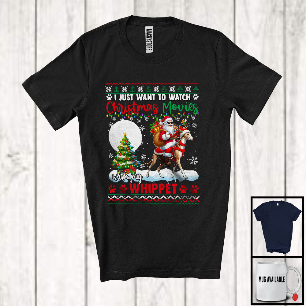 • Want To Watch Christmas Movies With My Whippet; Adorable Sweater Santa Riding Puppy T-Shirt. This cotton t-shirt is a durable staple product with a classic fit. One of the most popular items, it has a relaxed style made for everyday and casual wear.