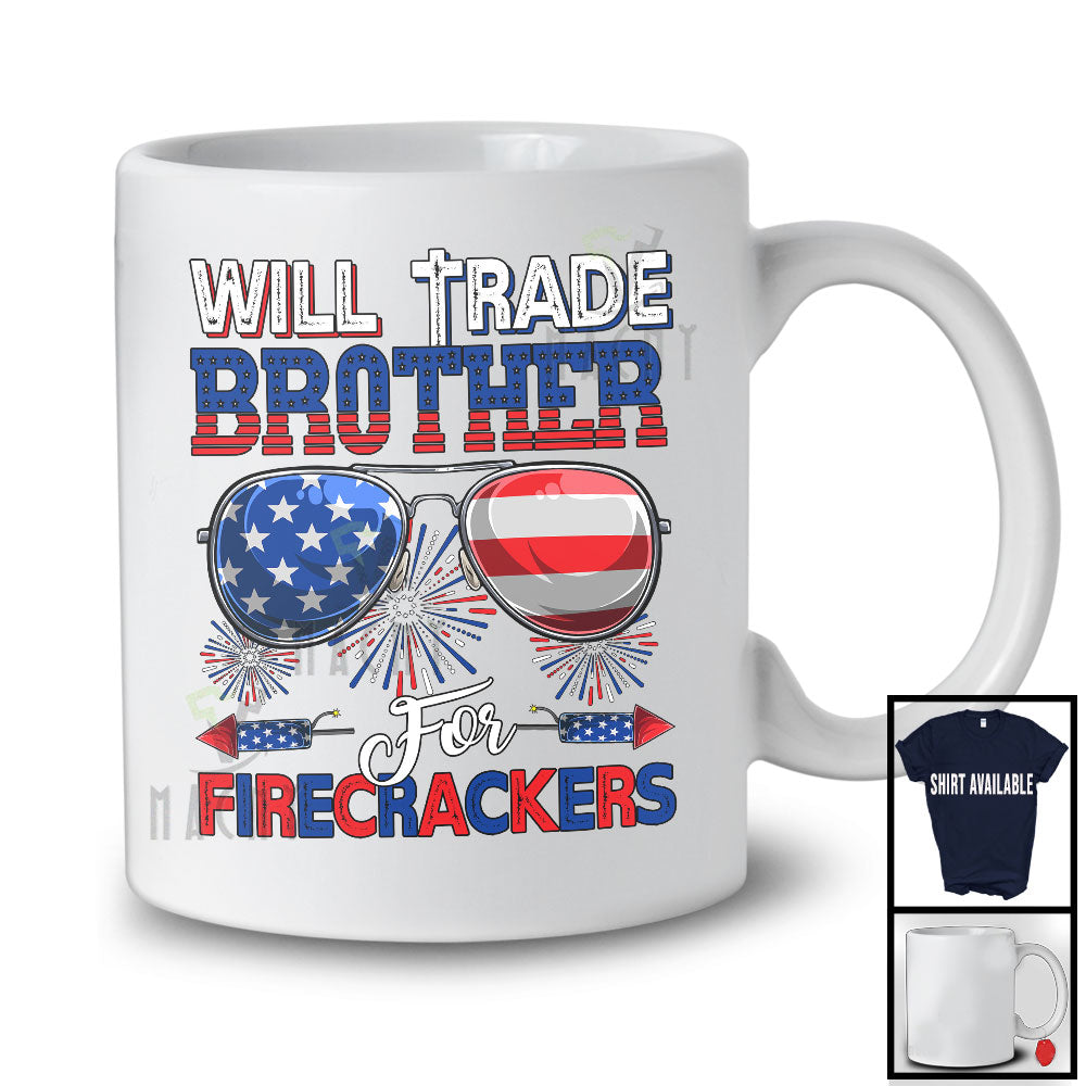 • Will Trade Brother For Firecrackers, Cheerful 4th Of July American Flag Sunglasses, Patriotic Family T-Shirt. This cotton t-shirt is a durable staple product with a classic fit. One of the most popular items, it has a relaxed style made for everyday and casual wear.